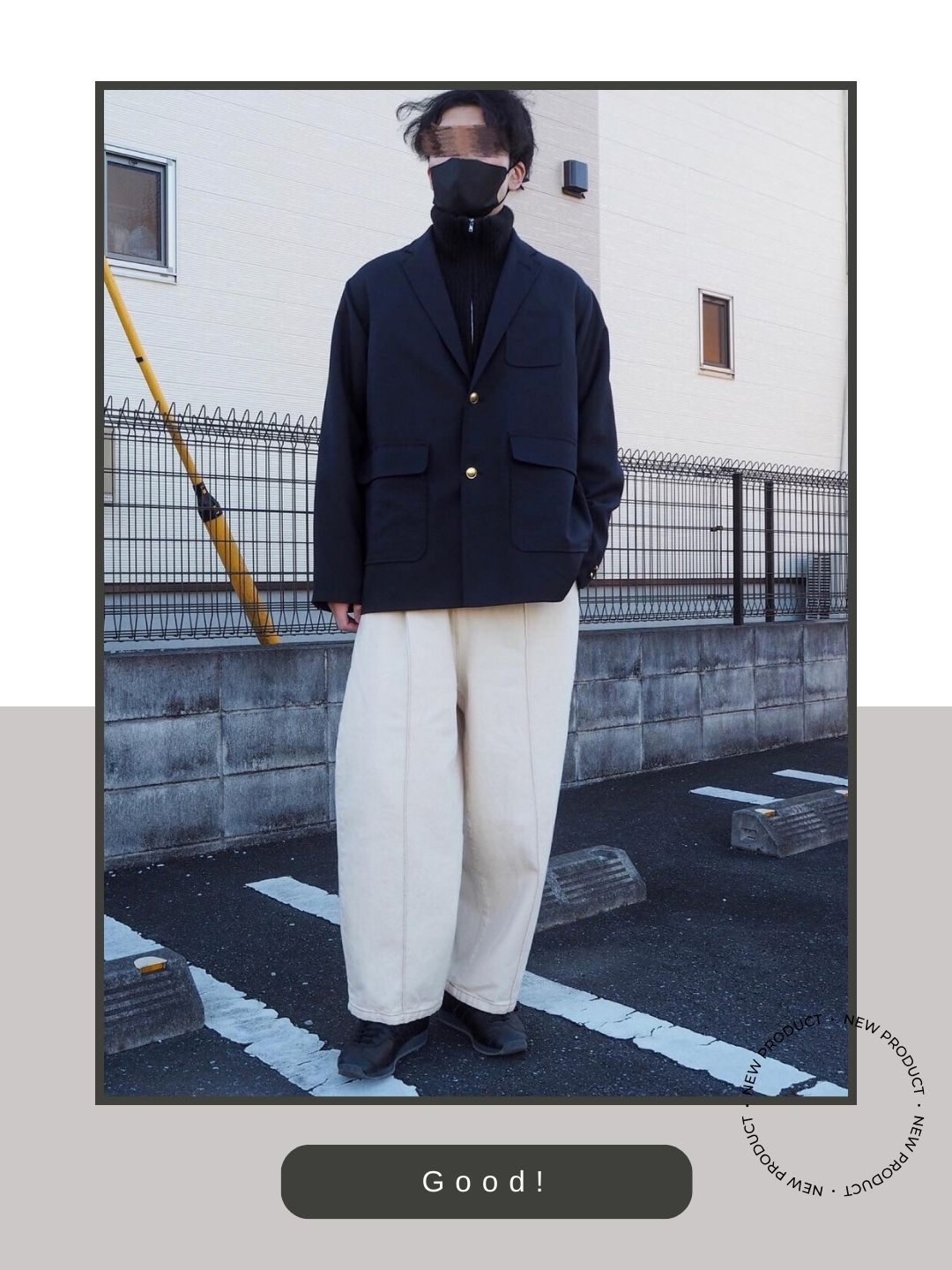 パンツのゆったりとしたラインを裾のリブで一度絞り、そこからカントリーのシャープなシルエットへと繋げることで、足元に無駄なボリュームを出さず、スマートな印象を与えています。