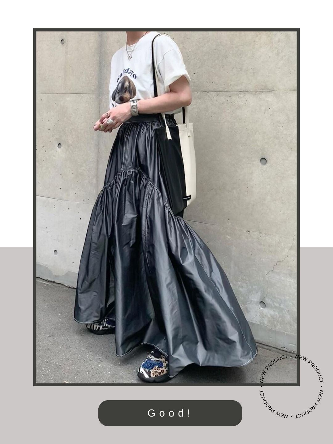 光沢のあるナイロン調のボリューミーなスカートに対し、レオパード柄やゼブラ柄をミックスした多色使いのファルコンを合わせたのが非常に大胆かつ巧みです。スカートのドラマチックなドレープ感と、スニーカーの複雑なパーツ構成・アニマル柄がぶつかり合うことで、互いの個性を引き立てるパワフルな足元を演出しています。