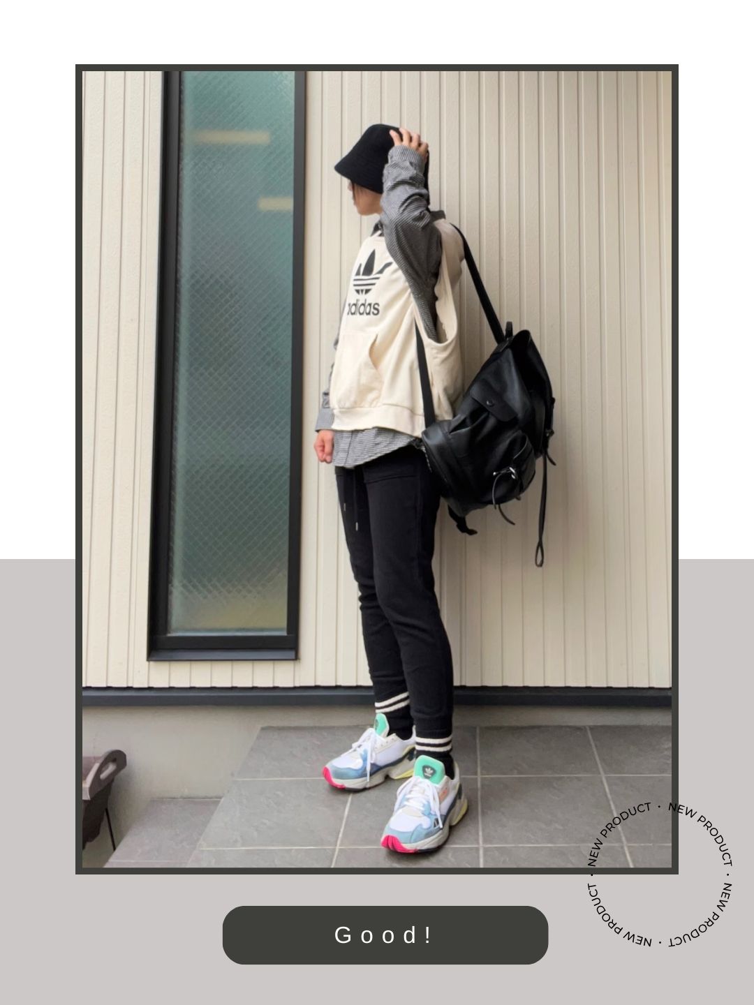 スニーカーのシュータンやソールに配された、鮮やかなミントグリーンやピンクのアクセントカラーが、ウェアのロゴや全体の雰囲気に絶妙な華やかさを添えています。ベストのロゴの黒とパンツの黒をリンクさせつつ、足元にポップな色味を差し込むことで、モノトーン基調の装いに楽しげなリズムを生んでいます。