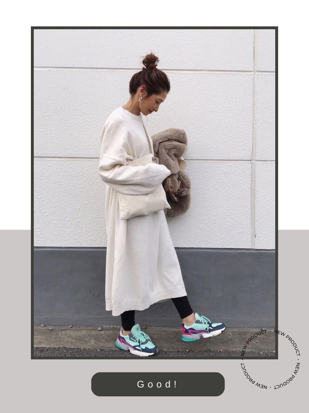 フェミニンで柔らかな印象のニットワンピースを、あえて無骨でボリュームのあるダッドスニーカーでハズすことで、コンサバになりすぎない絶妙なストリート感をプラスしています。足元にどっしりとした重量感を置くことで、ワンピースのふんわりとしたシルエットとの間に「重軽」のコントラストが生まれ、こなれたバランスに仕上がっています。