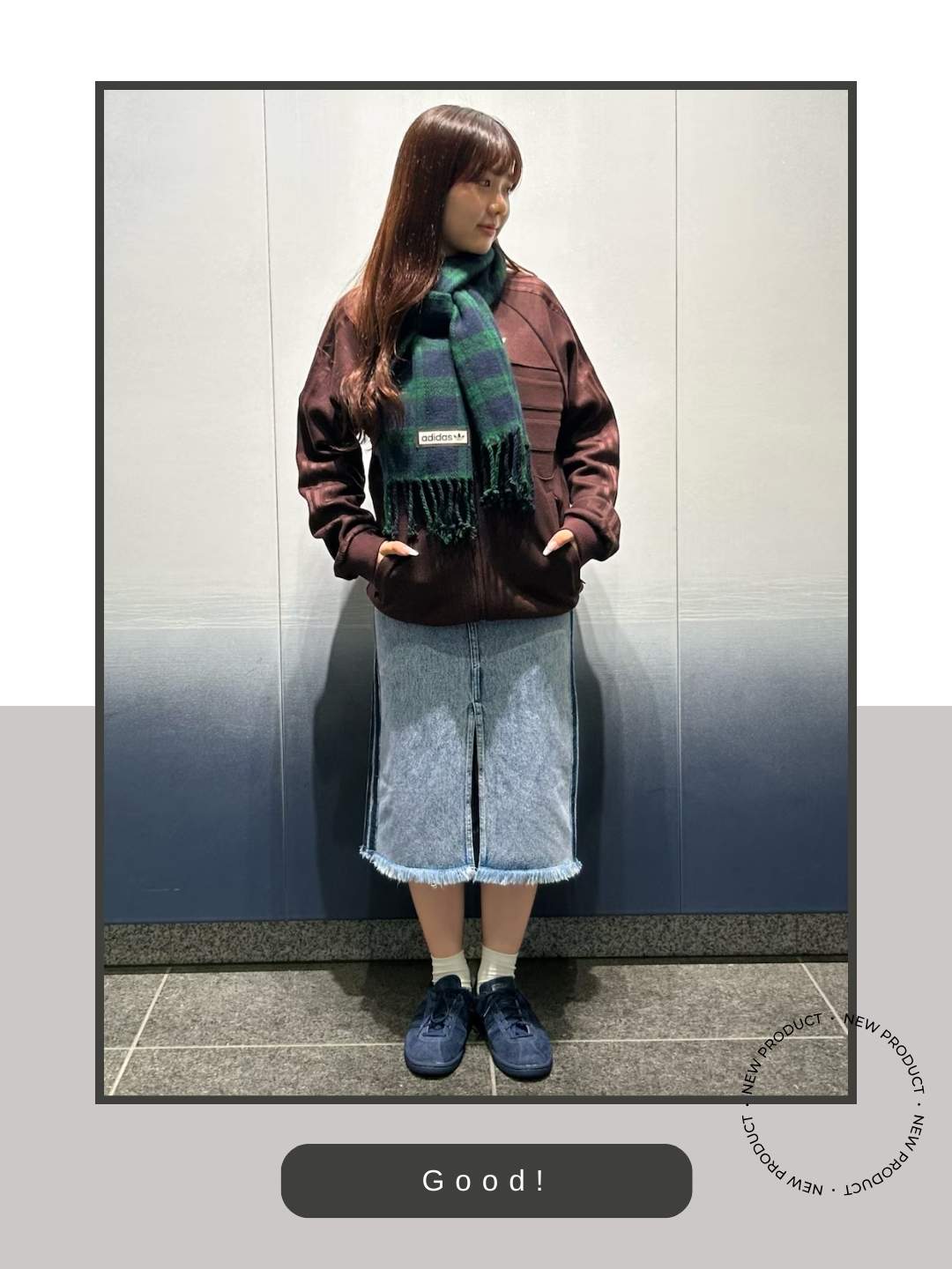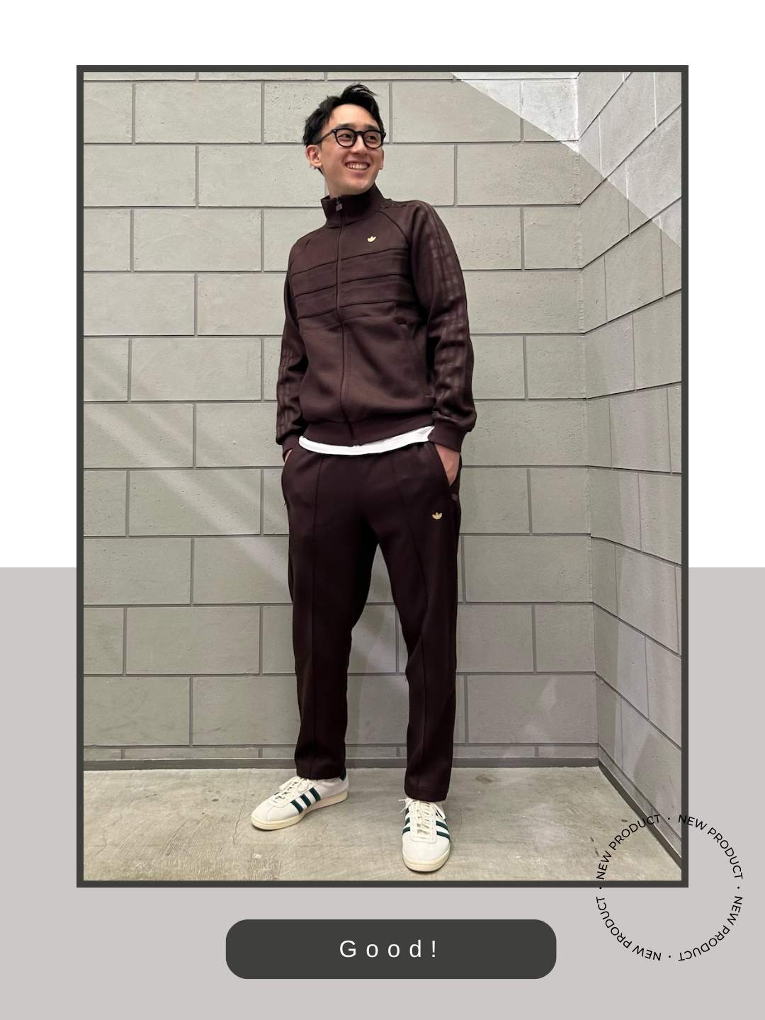 ブラウン一色だとダサいと見えがちですが、トップスの裾や足元の白が光の役割をしてくれるので、清潔感と軽やかさが出るコーディネートですね。アディダスのタバコは、起毛感のあるスエード素材が特徴。キャンパスほど主張が強くなく、スリムなシルエットのタバコだからこそ、セットアップのラインを壊さずスマートにまとまっています。