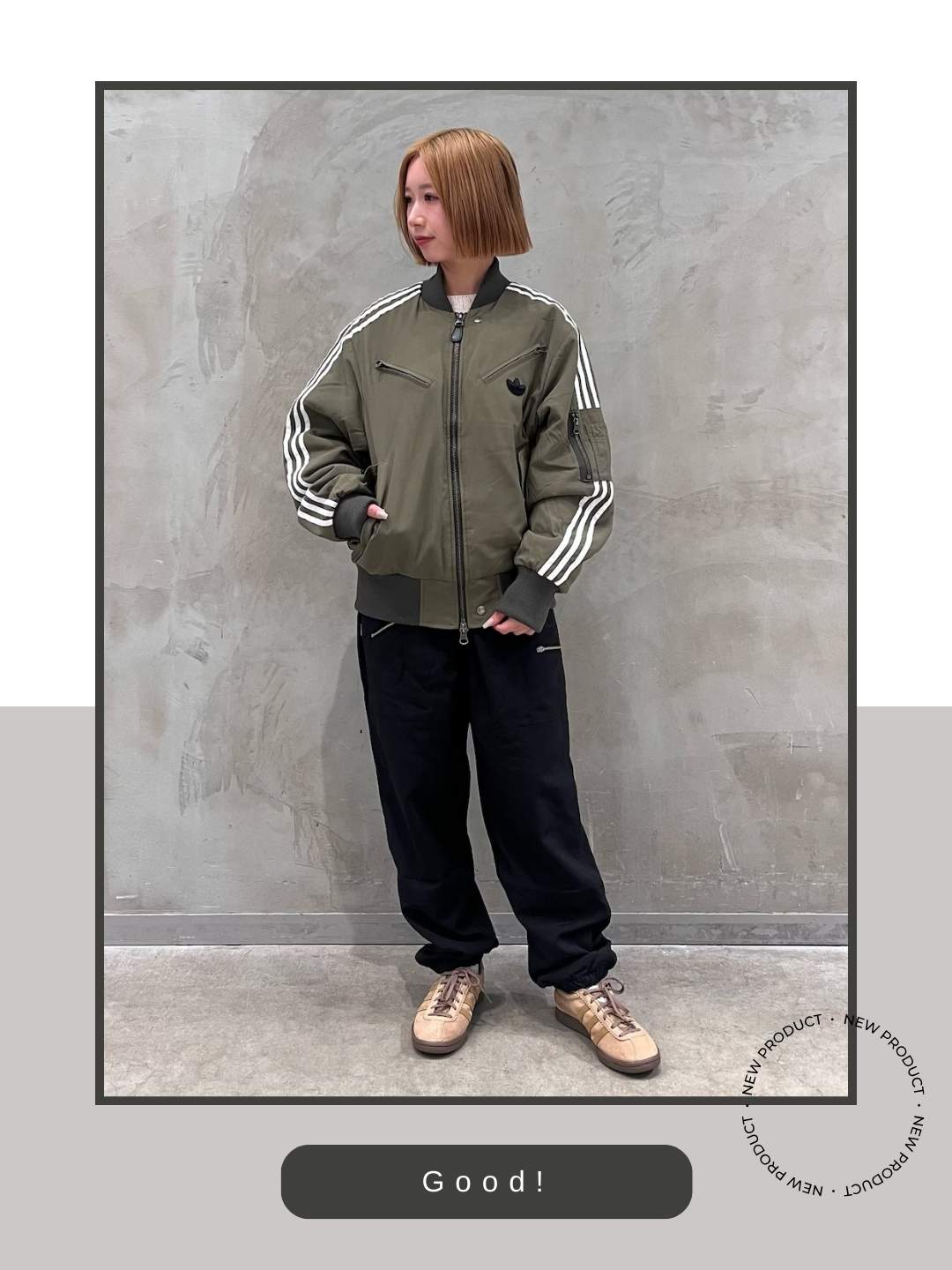 カーキのボンバージャケットに対し、足元に明るいブラウンのタバコを持ってくることで、全体をアースカラーでまとめるのもおすすめです。ミリタリー感のあるトップスに対し、スニーカーがトーンを合わせつつも、スエードの柔らかな質感を加えることで、上品さが感じられる大人っぽいバランスに仕上げられますよ。