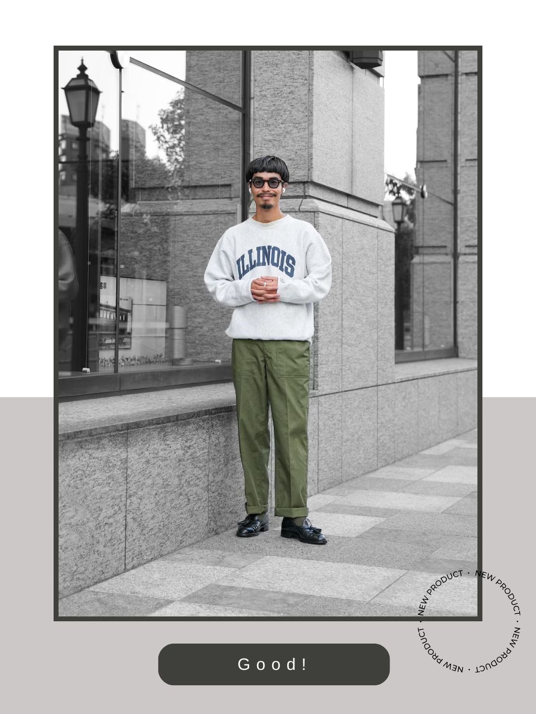 スウェットと軍パンという非常にカジュアルな組み合わせに対し、フロントにタッセル(飾り房)のついたタッセルローファーを合わせたのが非常に巧みなポイントです。スニーカーや無骨なワークブーツではなくALDENが元祖とされるタッセルローファーを選ぶことで、ラフな装いに「トラッドな品格」と「都会的な洗練」を同時にプラスしています。