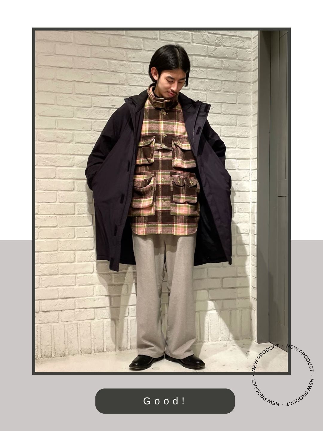 インナーのチェック柄や全体のアウトドア・ワーク寄りのニュアンスに対し、足元に艶やかなブラックのALDENを置くことで装いを都会的に引き締めています。ワークブーツではなくドレスシューズの出自を持つALDENを選ぶことで野暮ったさを回避し、大人の洗練されたシティー・スタイルへと昇華させています。