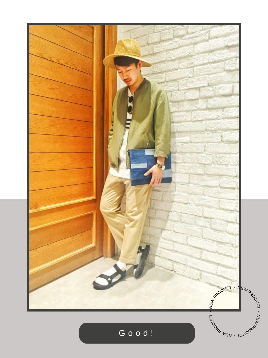 ナチュラルでリラックスした印象のベージュのアンクルパンツに、あえて白い靴下を合わせ、それをサンダルと組み合わせている点が非常にスマートです。このスタイルが、サンダル特有のラフさを抑制し、洗練された大人のカジュアルへと昇華させています。