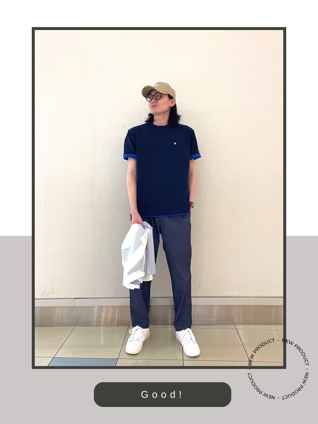 ネイビーのTシャツとアンクル丈パンツという落ち着いたトーンに対し、アーノルドパーマーの真っ白なレザースニーカーが、コーディネート全体に鮮烈な明るさと清潔感を与えています。足元に純白を持ってくることで重くなりがちなダークカラーの着こなしに「抜け感」が生まれ、夏の日差しに映える軽やかな印象に仕上がっています。