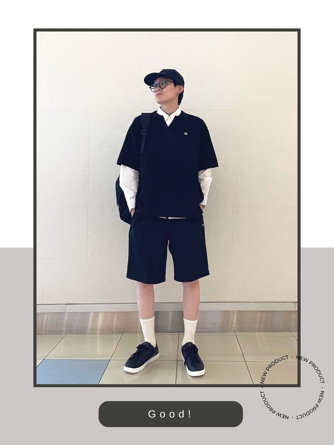 黒いスニーカーに対し、クリーンな白ソックスを合わせることで足元に鮮やかなコントラストを生んでいます。ハーフパンツスタイルは幼く見えがちですが、この「黒スニーカー×白ソックス」の組み合わせが育ちの良さを感じさせるプレッピーな品格を与え、大人っぽいスポーツミックスへと昇華させています。