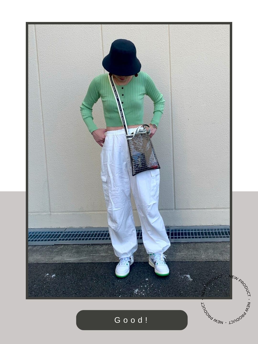 このコーディネートの最大の勝因は、トップスのニットの色とバッシュのソールやロゴに配された鮮やかなグリーンを完璧にリンクさせている点です。上下で同じ色をリフレインさせることで、一見難易度の高いカラーアイテムを非常に計算された洗練された着こなしへと昇華させています。