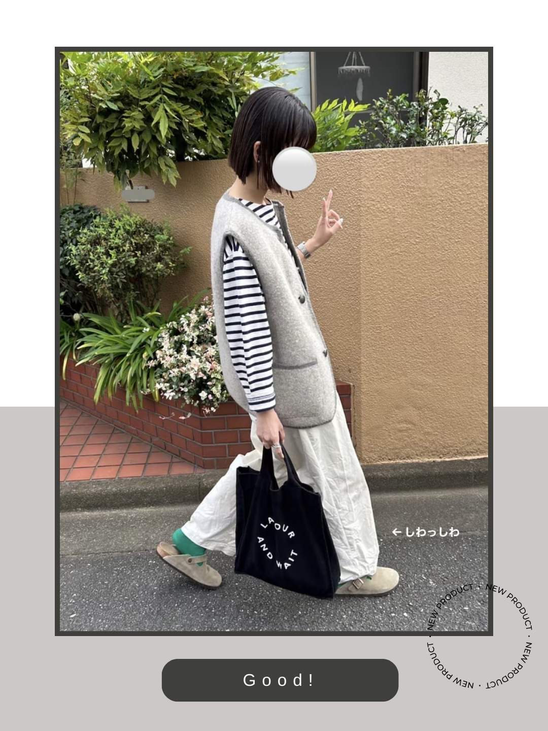 白のワイドパンツとベージュのビルケンシュトックという柔らかなトーンに対し、パッと目を引くグリーンの靴下を合わせている点が非常にスマートです。この鮮やかな差し色が、ほっこりしがちなナチュラルスタイルに洗練されたメリハリを与え、都会的な印象へと昇華させています。