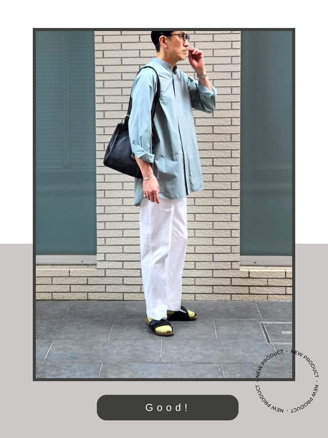 シャツの淡いブルーとパンツの白という非常にクリーンな配色に対し、あえて黒のビルケンシュトックと鮮やかなイエローの靴下を合わせている点が非常にスマートです。この足元の強いコントラストが、全体の淡いトーンを引き締め、都会的で洗練された印象へと昇華させています。