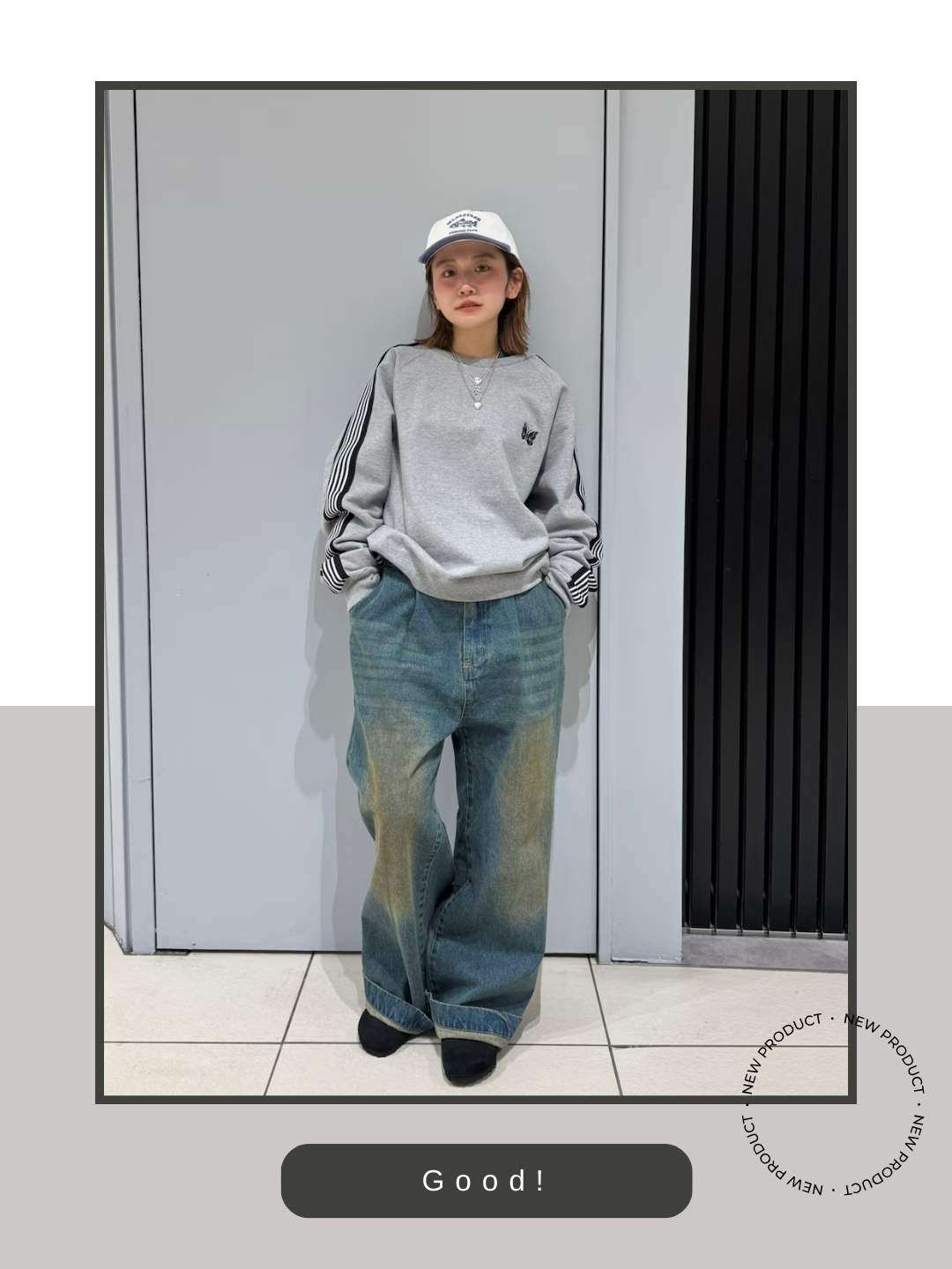 オーバーサイズのスウェットと、ヴィンテージ感のあるワイドデニムというボリュームのある組み合わせに対し、丸みのあるビルケンシュトックを合わせている点が非常にスマートです。デニムの裾から覗くサンダルと靴下の質感が、リラックスしたスタイルにおしゃれな奥行きを与えています。
