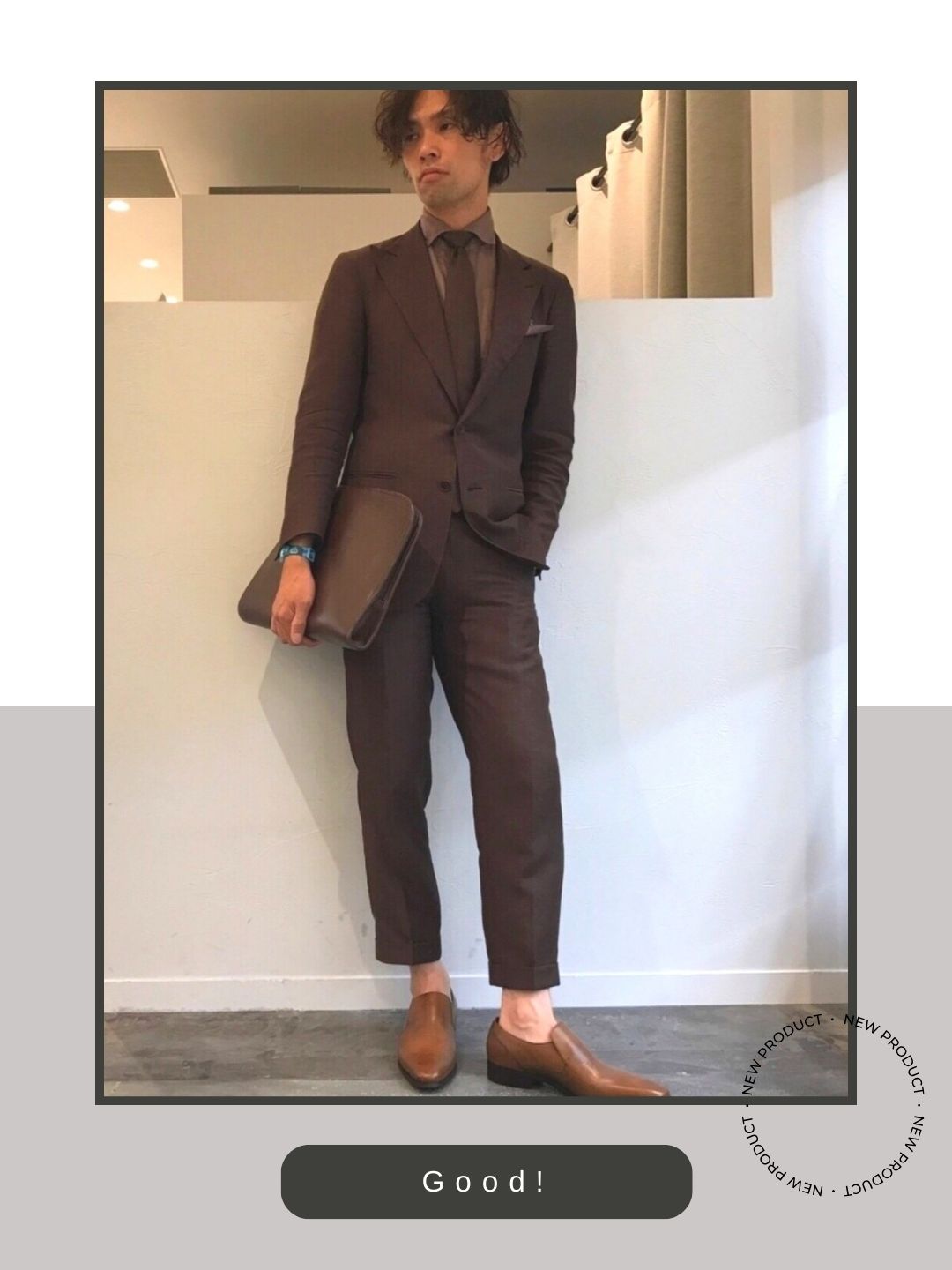 ジャケット・タイ・バッグ・靴をすべてブラウン系のグラデーションでまとめた中で、足元の明るいライトブラウンのレザーが絶妙な「抜け感」として機能しています。 チゼルトゥ特有の立体的なフォルムが光を反射し足元に美しい陰影を作ることで、単調になりがちなワントーンコーデに奥深さを与えています。