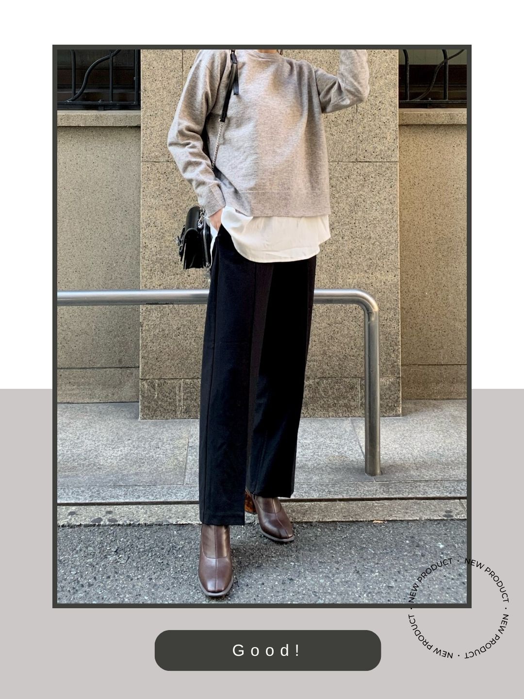 膝から裾にかけて広がるフレアパンツのラインに対し、つま先が直線的にカットされたチゼルトゥは非常に相性が良い組み合わせです。裾広がりのシルエットから、スッと鋭いつま先が覗くことで、足元に知的な緊張感が生まれ、洗練された大人の女性像を演出しています。