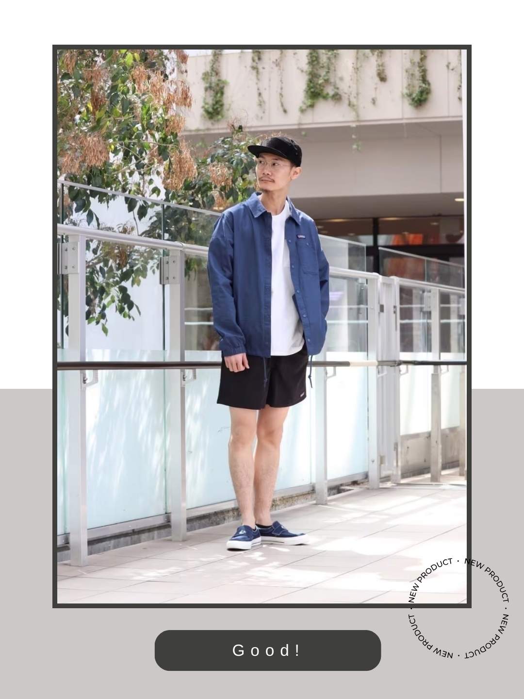 コーチジャケットとショーツというスポーティーでアクティブな組み合わせに対し、紐のないスリッポンタイプを合わせることで、足元を非常にスッキリと見せています。この「いなせ(洗練された)」な選択が、スニーカー特有のボリューム感を抑え、都会的で軽やかな洗練された印象を与えています。