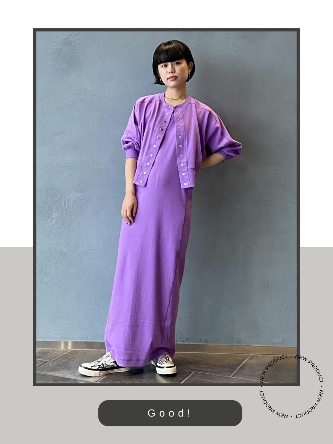 上下をパープルで統一した、非常に存在感のあるロングシルエットに対し、足元にミニマルなモノトーンのスリッポンを合わせることで、全体のインパクトを邪魔せず、上品な「抜け感」を作っています。この「いなせ(洗練された)」なハズしによって、ドレッシーになりすぎない都会的なデイリーウェアへと昇華されています。