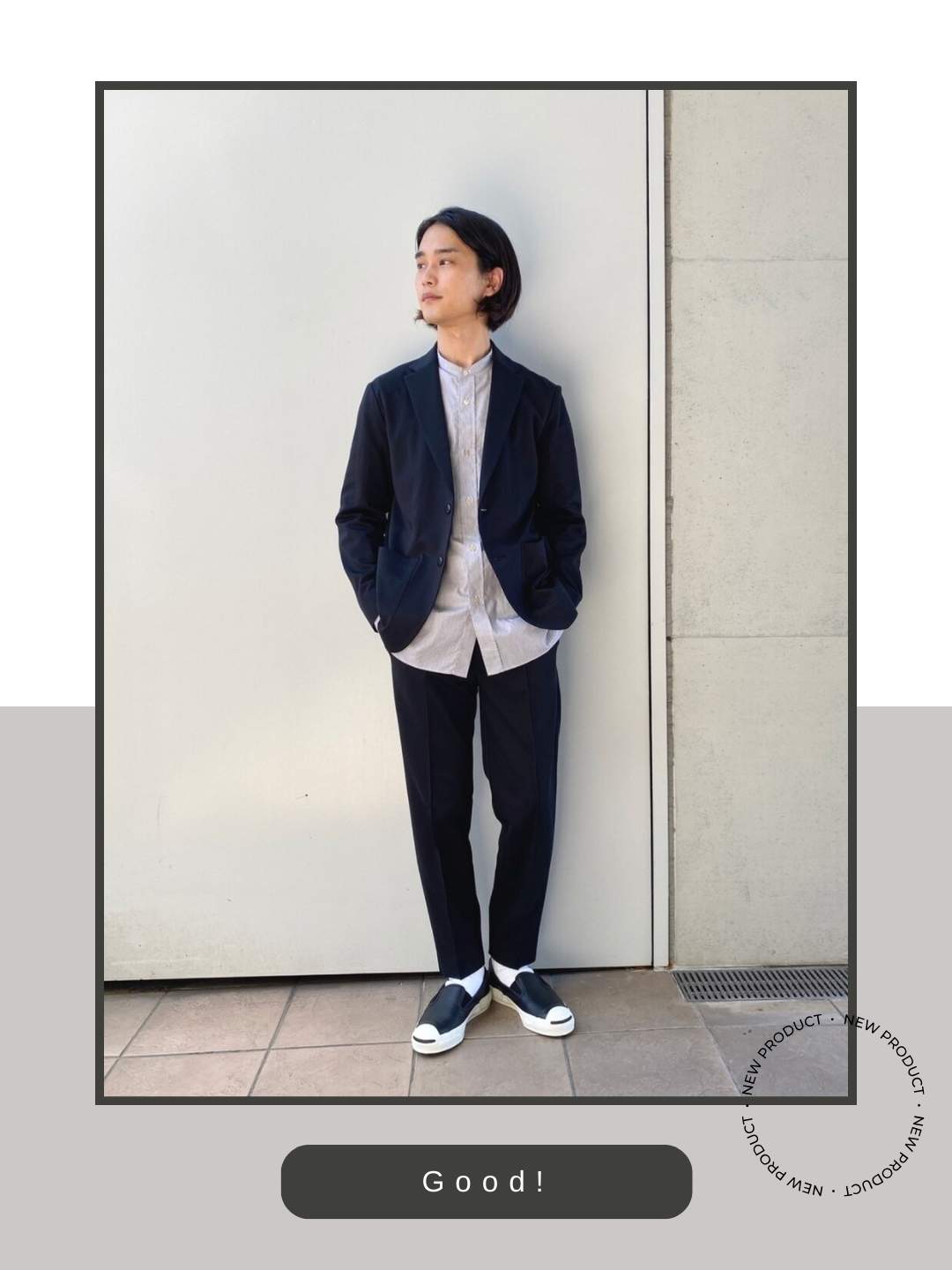 ネイビーのジャケットとスラックスという、フォーマル寄りのセットアップに対し、あえてコンバースのスリッポンを合わせることで、堅苦しさを排除した抜群のこなれ感を演出しています。紐がないスリッポンタイプは、スニーカーでありながらローファーのような「面」の美しさがあるため、セットアップの品格を損なわず、非常に洗練されたバランスで着地しています。