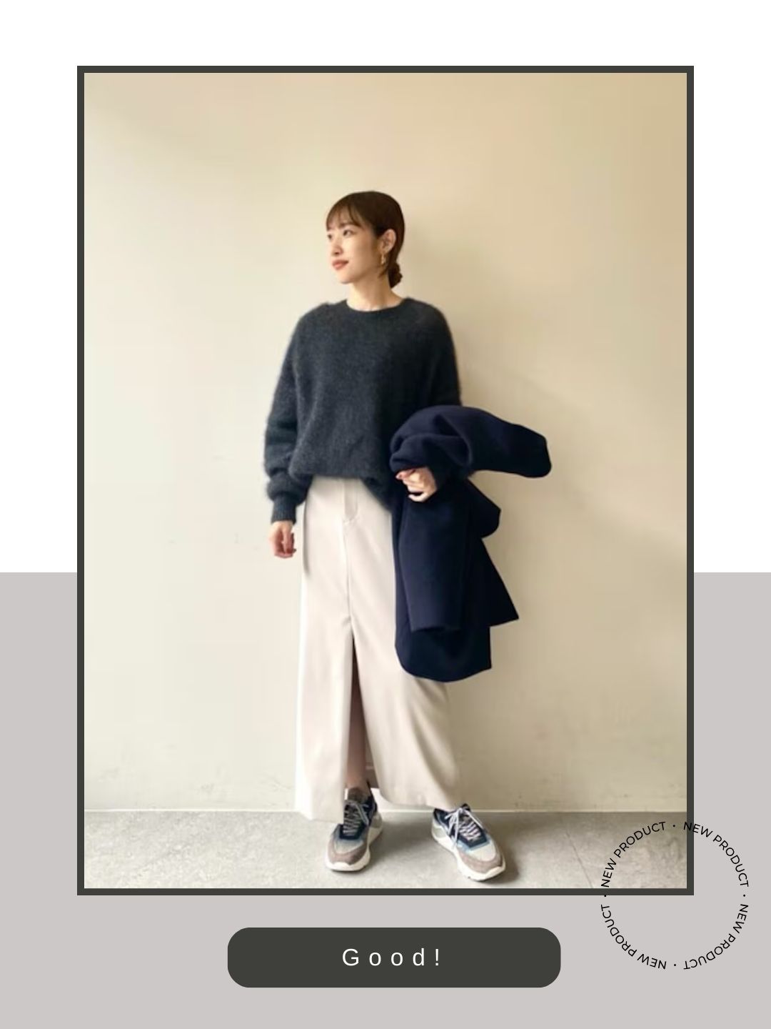 | 50-60代 | ラグジュアリーな「ハズし」の品格 | ホワイトデニムやライトグレーのウールパンツ + カシミアニット。スニーカーの質感を「こだわり」として見せ、品良くまとめる。 |