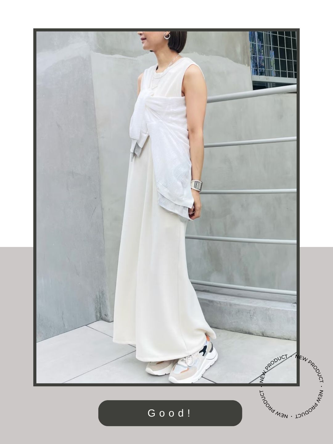 足首まであるマキシ丈のボトムスに対し、D.A.T.E.らしいボリューム感のあるソールを合わせることで現代的なシルエットを構築しています。 重厚感のある足元がノースリーブの軽やかなトップスとのバランスを取り、コーディネートに「モードな安定感」をもたらしています。