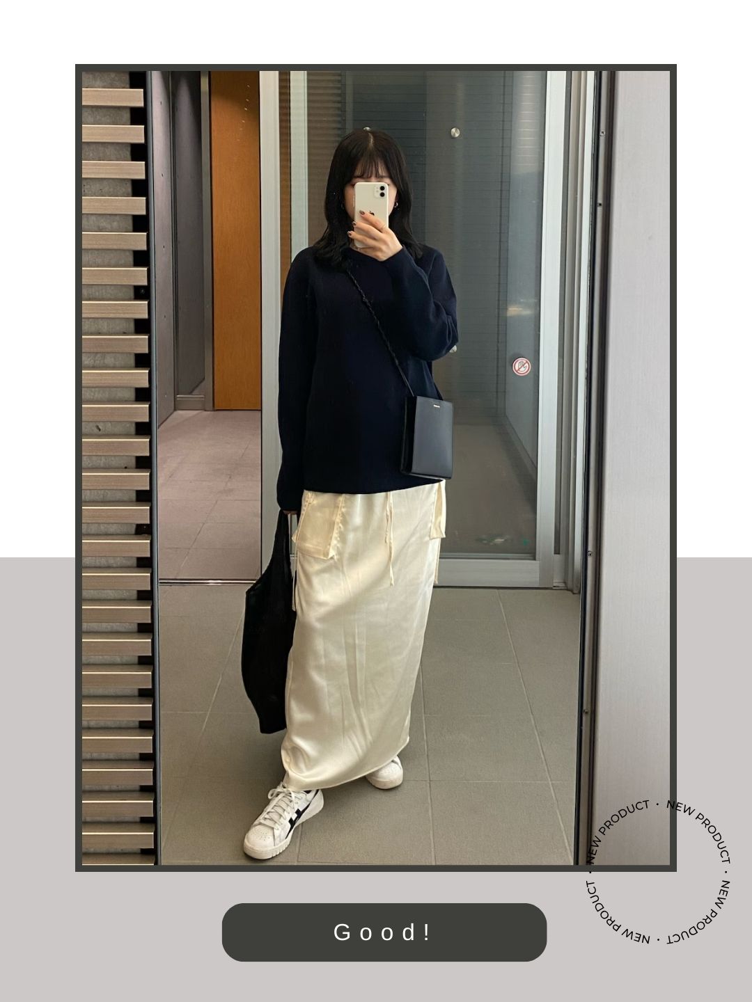 GEL-PTGの端正なデザインが、きれいめなスカートスタイルにほどよいカジュアル感をプラスし、頑張りすぎない「大人のこなれ感」を演出しています。ネイビーのニットと光沢感のあるアイボリーのスカートという、大人っぽく柔らかな色合いの装いに対し、白ベースのGEL-PTGが馴染むことで、全体に軽やかでクリーンな統一感が生まれています。