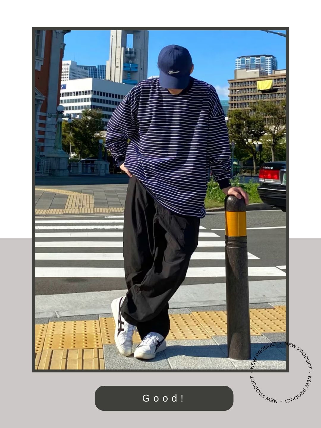 ボーダーのカジュアルなトップスと、ボリュームのあるテック系のパンツという組み合わせに対し、コートシューズ由来のGEL-PTGのクラシックなフォルムが加わることで、ラフになりすぎない「大人なストリート感」を演出しています。
