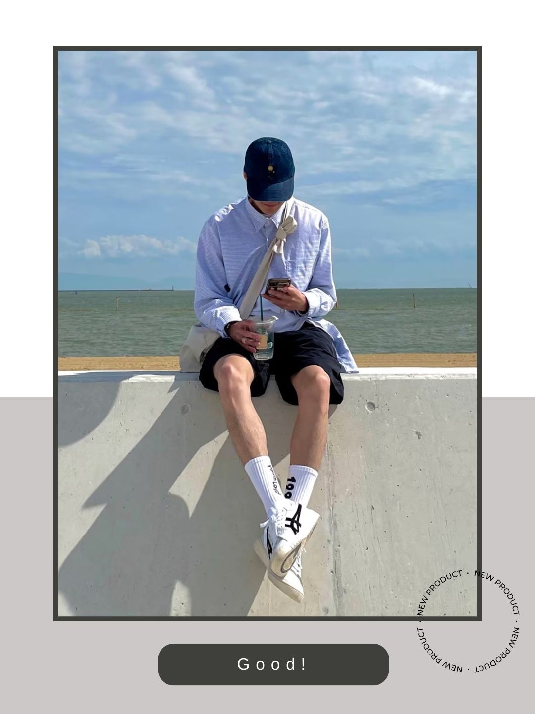 ロゴ入りの白ソックスとGEL-PTGを組み合わせることで、足元にストリート特有のスポーティーなリズムが生まれ、ショートパンツとのバランスが非常に美しく整っています。
