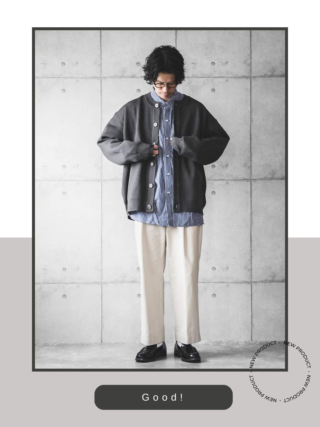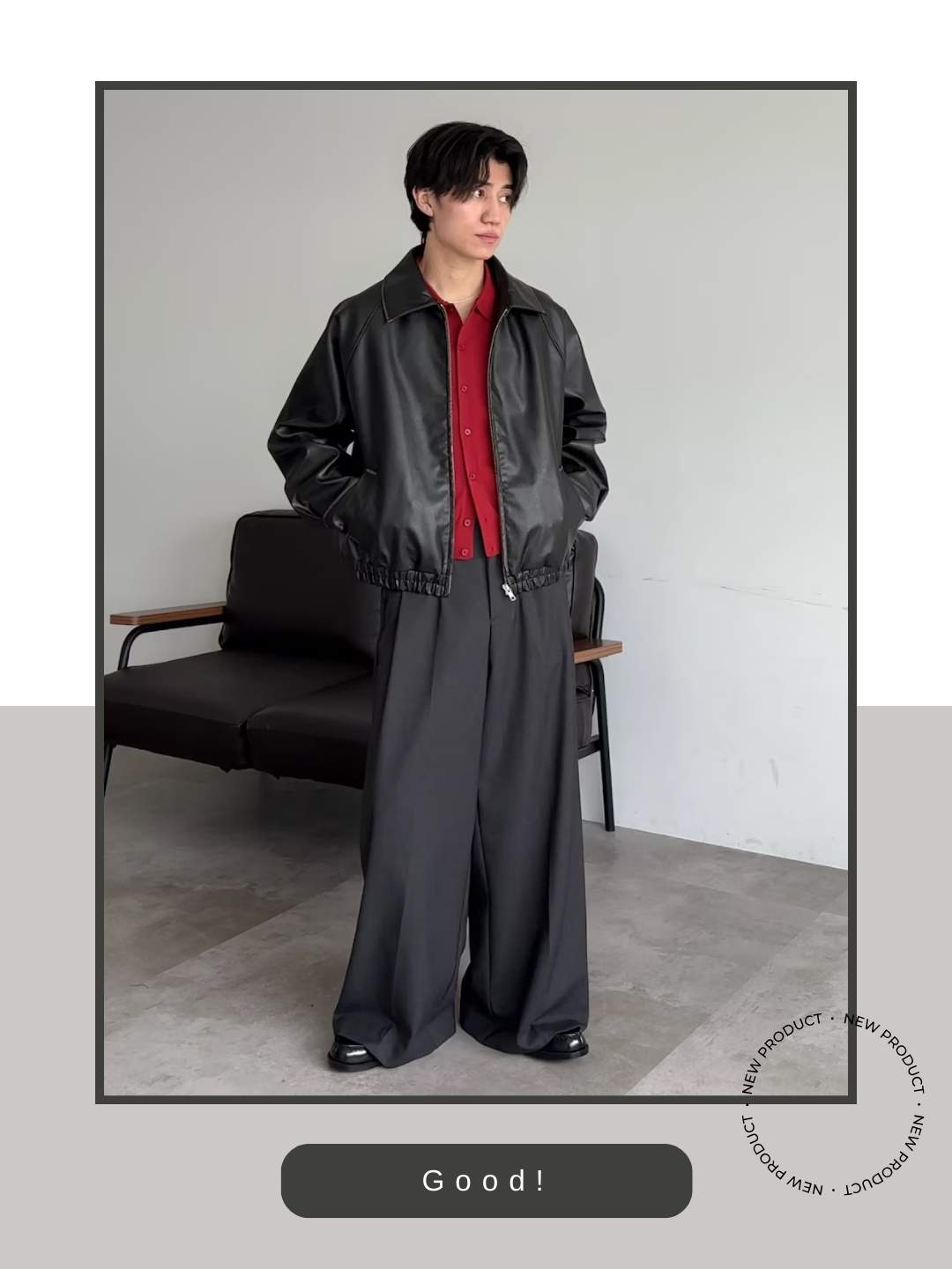 ボリューム感のあるグレーのワイドスラックスに対し、ハルタ特有の美しい光沢を放つレザーローファーが、全体のシルエットを足元でグッと引き締めています。この「いなせ(洗練された)」な素材の対比が、ルーズになりがちなボトムスに洗練された品格を与え、都会的な印象を強めています。