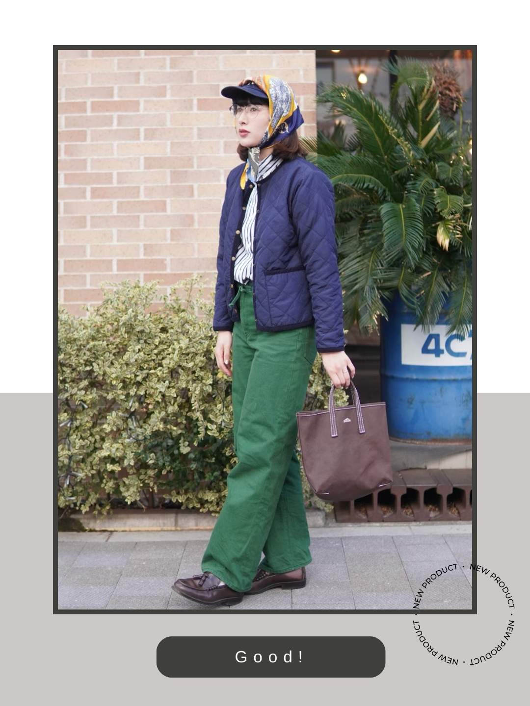 ネイビー、グリーン、そしてスカーフのイエローといった多色使いのスタイリングにおいて、ハルタのブラウンローファーが全体のカラーバランスを落ち着かせる「重石」の役割を果たしています。この「いなせ(洗練された)」な配色選びにより、個性の強いアイテム同士が喧嘩せず、洗練された大人のカジュアルスタイルへと昇華されています。