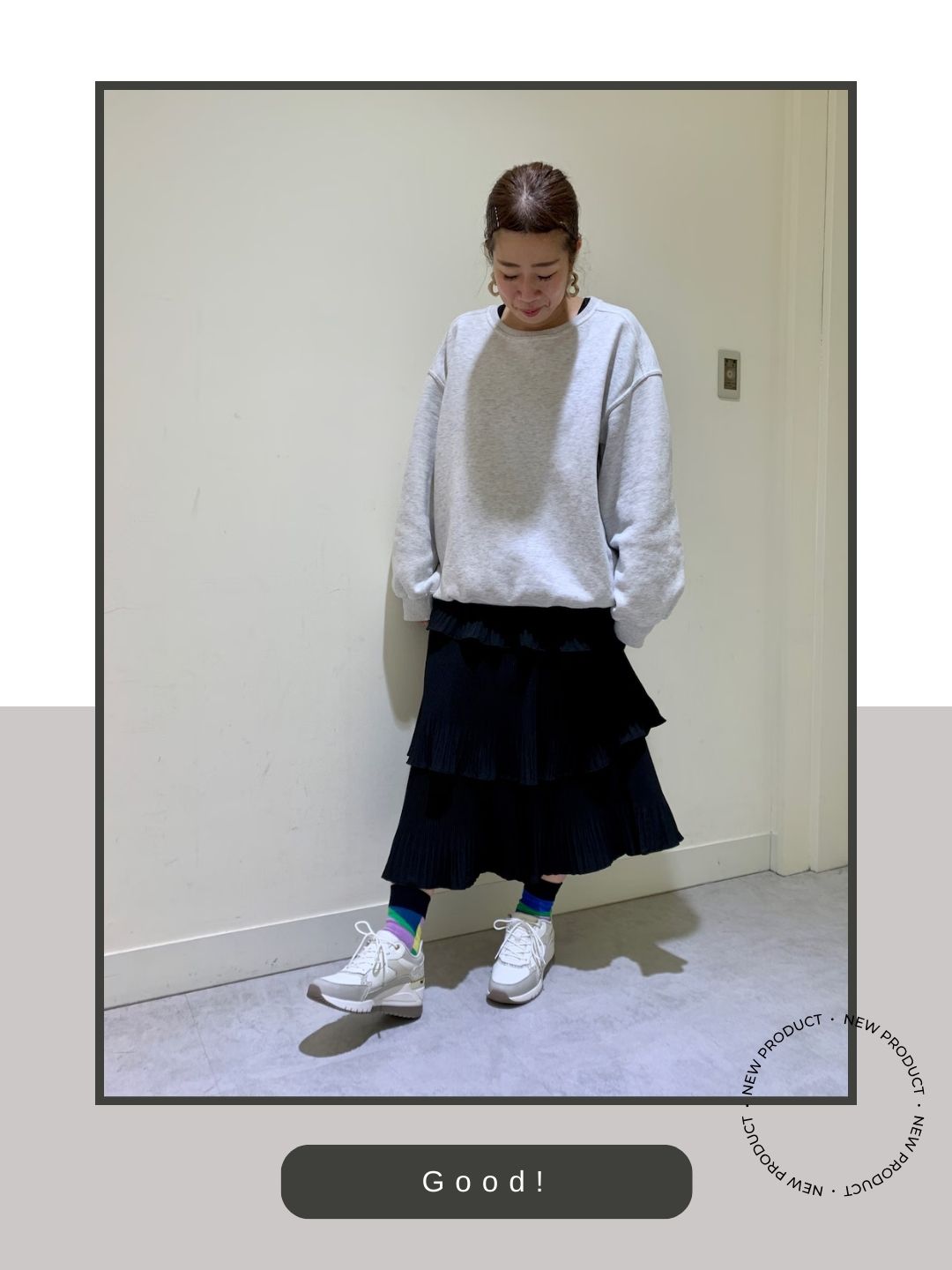 ティアードスカートの持つボリューム感に対して、ヒールスニーカーが足元に程よい高さを出すことで、全体が重たくなりすぎず、すっきりとしたバランスに仕上がっています。スウェットとスカートを合わせたリラックス感のあるスタイルに、ヒールのあるデザインを合わせることで、女性らしさとスポーティーな雰囲気が程よく調和しています。