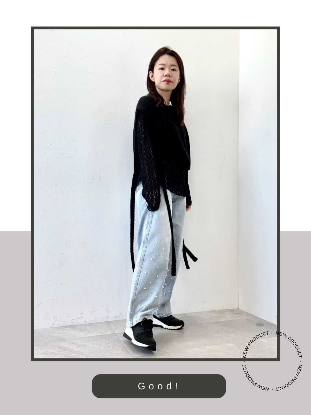 パールが散りばめられたデニムや、透け感のあるメッシュ素材のトップスというフェミニンな要素が強いコーディネートに対し、ブラックのヒールスニーカーが足元をスマートに引き締め、甘さを抑えた洗練された大人カジュアルへと昇華させています。