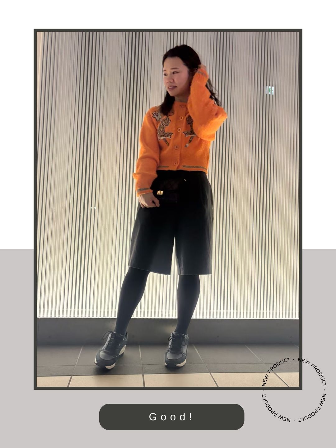 ショートパンツとタイツを合わせた着こなしに対し、ヒールスニーカーが適度な高さをプラスすることで、脚のラインを美しく見せつつ全身のシルエットをバランスよく整えています。鮮やかなオレンジの刺繍入りカーディガンが主役の華やかなスタイルにおいて、足元にブラックのヒールスニーカーを合わせることで、装い全体を大人っぽく引き締めています。