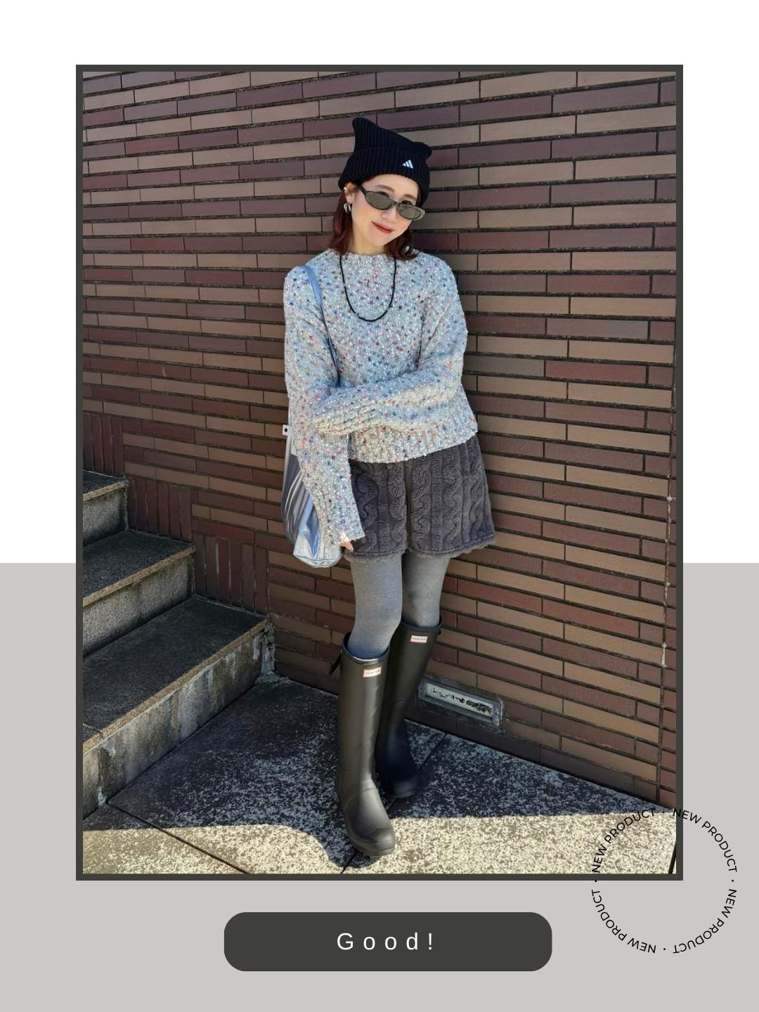 淡い色味のミックスニットとファーのような柔らかな素材のショーツという、非常に可愛らしい上半身に対し、ハンター特有のマットな質感のロングブーツが絶妙な引き締め役になっています。この「甘さと重さ」のバランスが、全体を子供っぽく見せない洗練された大人のミックススタイルに仕上げています。