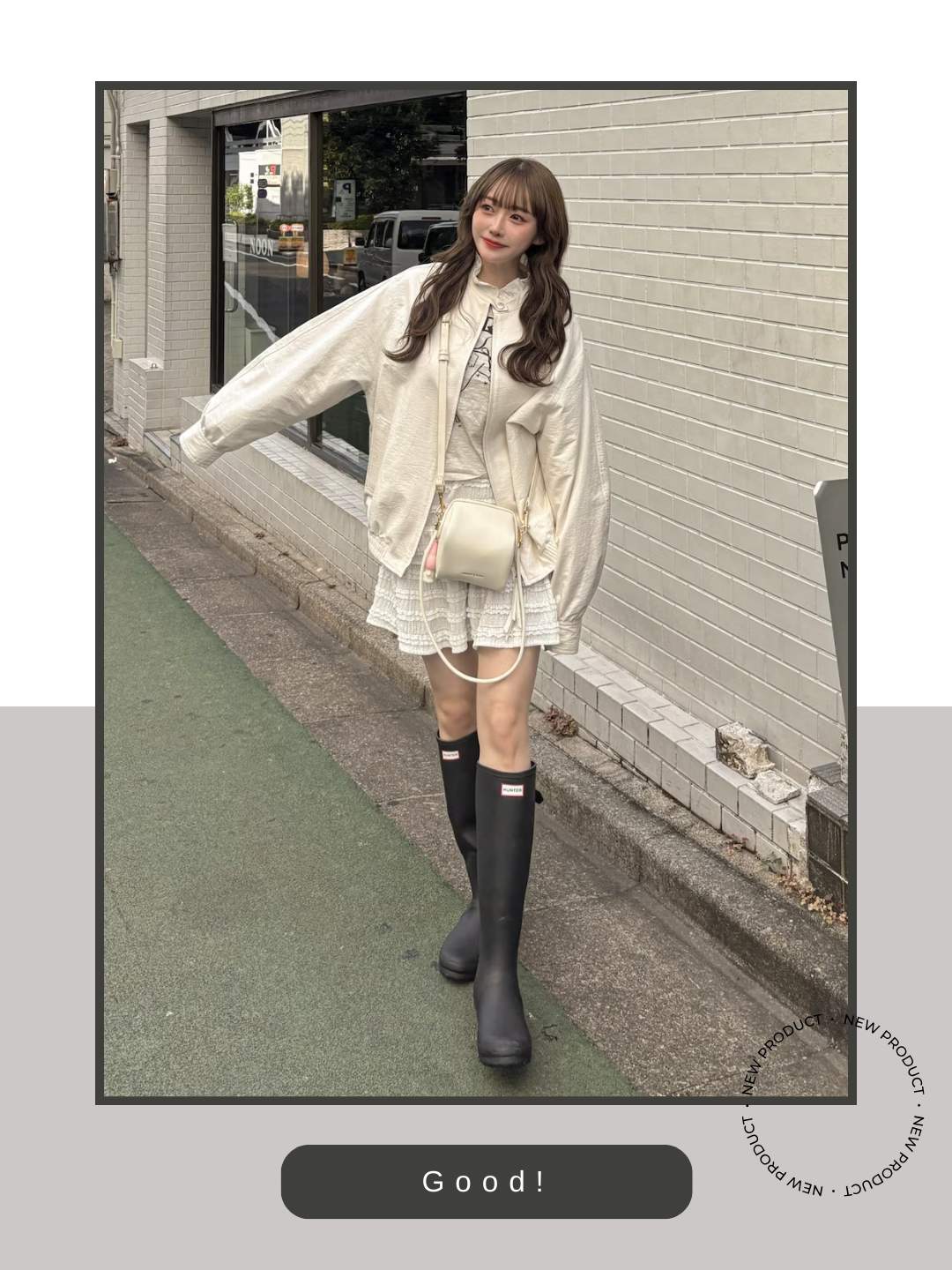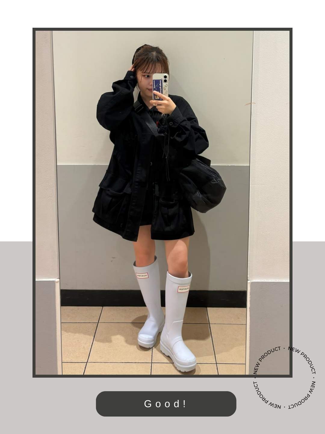 アウターからボトムス、バッグまでをクリーンな白で統一した装いに対し、足元にハンターの黒いロングブーツを持ってくることで、全体がボヤけず、非常に洗練された印象に仕上がっています。この明快なモノトーンの対比が、都会的で力強いアクセントになっています。