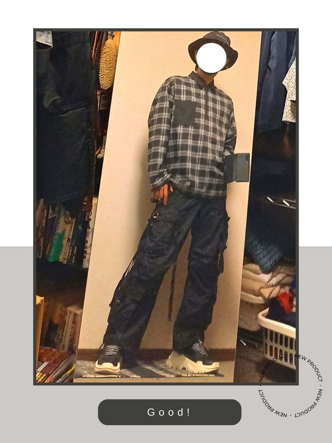 ダークトーンのチェックシャツとネイビー系のパンツという落ち着いた配色の中で、スニーカーの真っ白なソールが鮮烈なヌケ感を作っています。足元に明るい白を持ってくることで、全体が暗くなりすぎず、清潔感と都会的な軽快さをプラスしています。