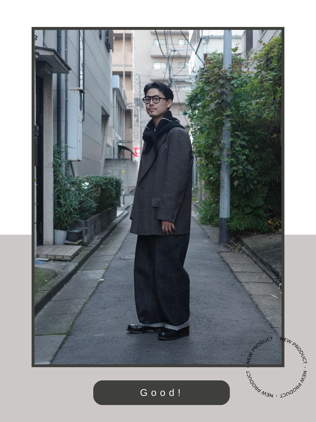 デニムをロールアップしあえて靴の全貌を見せることで、ゴルフの特徴である堅牢なラバーソールの質感が際立っています。レザーソールほど気取らず、スニーカーほどラフすぎない。この絶妙なバランスが肩掛けしたニットのリラックス感や路地裏の風景と見事にマッチし、アクティブでこなれた印象を与えています。
