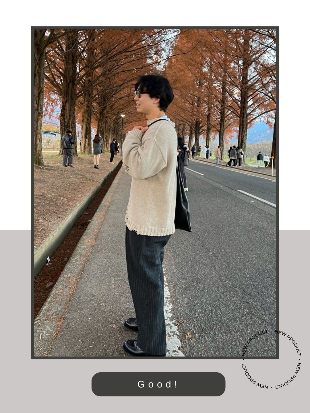 首元や裾にダメージ加工が施されたラフなニットに対し、最高峰の既製靴であるゴルフを合わせることで「あえてのハズし」としての知性が光ります。カジュアルに寄りすぎるのを防ぎ、並木道での散策というシーンにふさわしいエレガントで余裕のある大人な印象をキープしています。