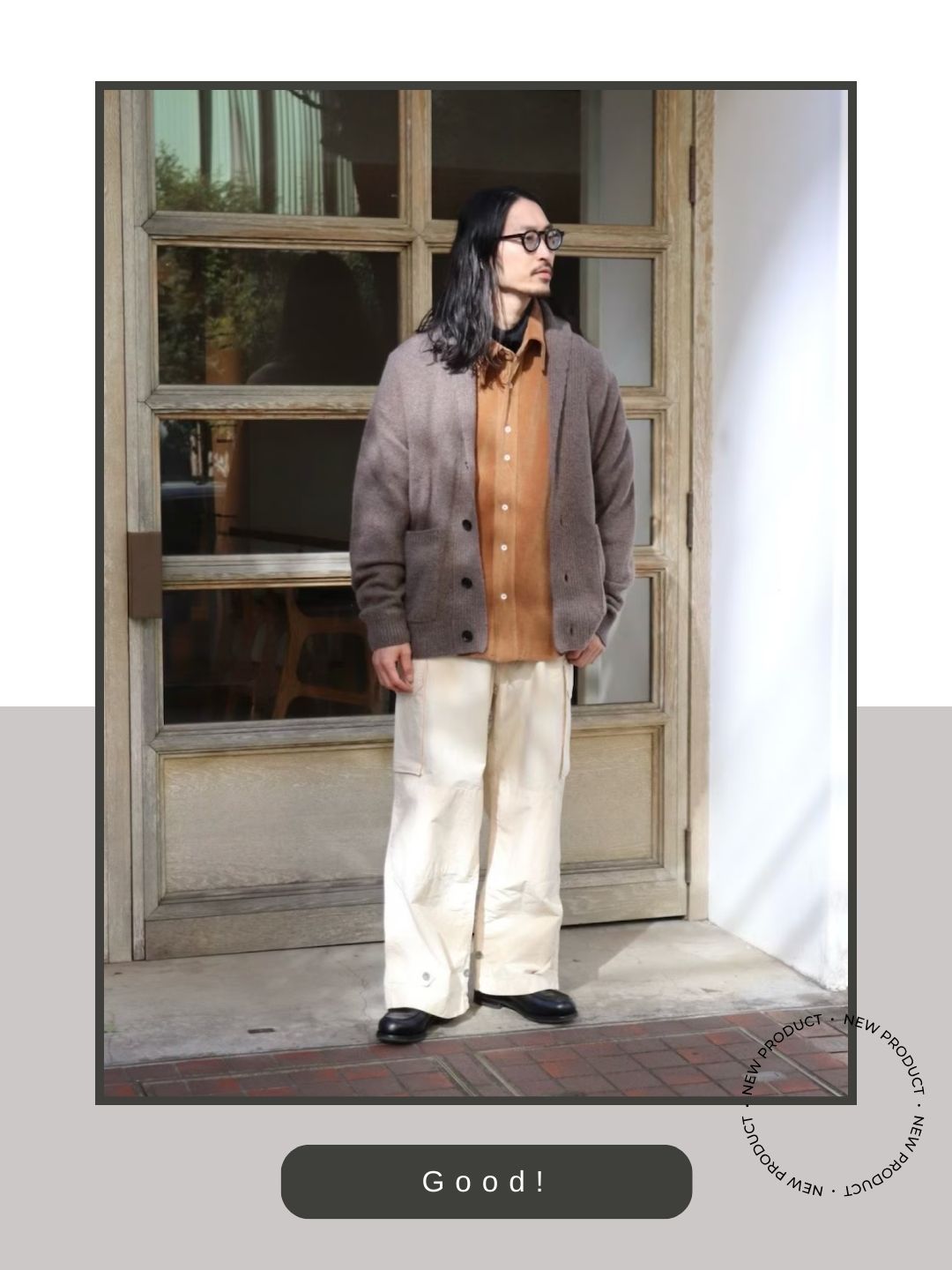 裾幅の広いオフホワイトのカーゴパンツに対し、ゴルフ特有のボリュームのあるエプロンフロント(Uチップ)が抜群の相性を発揮しています。パンツの分量感に負けない重厚なフォルムが全体のシルエットをどっしりと安定させ、リラックスした装いの中に「強さ」を与えています。