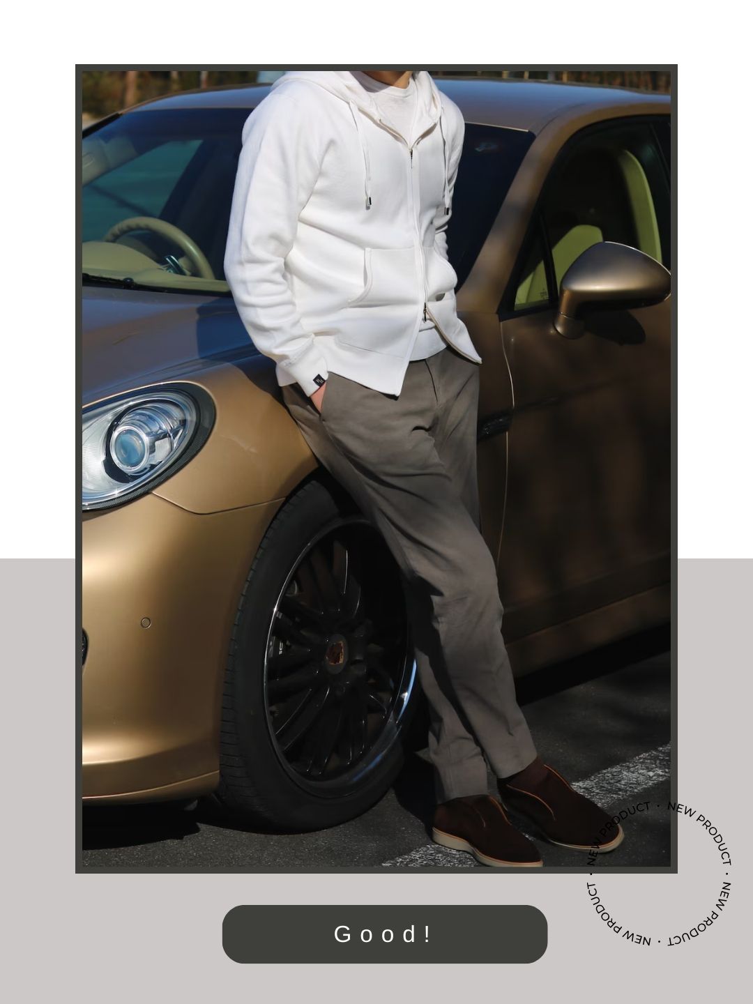 パーカーというカジュアルなトップスに対し、スペインの職人技が光るマグナーニのチャッカブーツ(またはスニーカー仕立てのミッドカット)を合わせたのが最大のポイントです。スポーティーな上半身を足元のスエードの柔らかな質感と深いブラウンの色味で引き締めることで、ゴルフ帰りやドライブデートにも最適な「品格のある休日スタイル」に格上げしています。