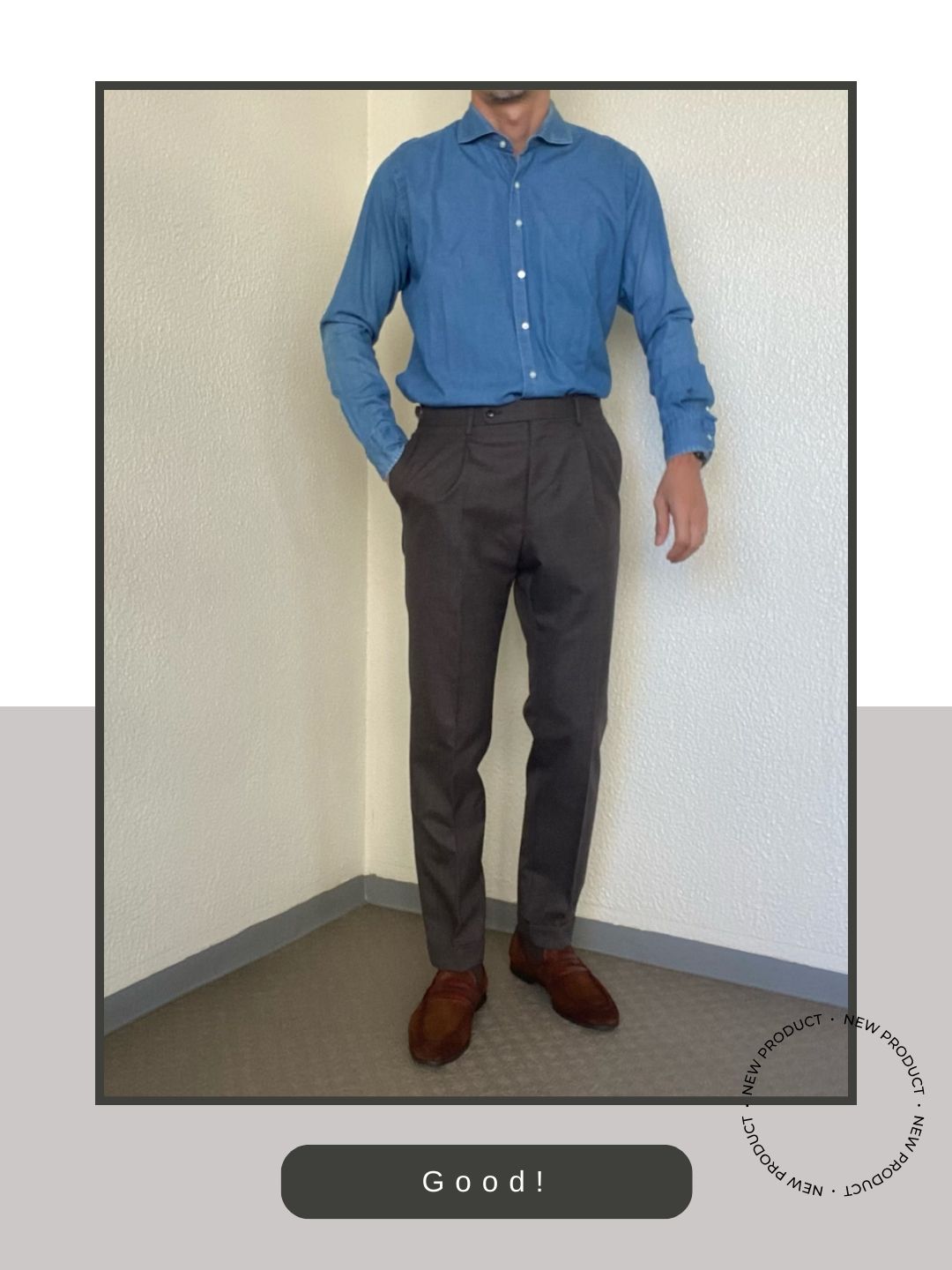 イタリアの洒落者が好む「アズーロ・エ・マローネ(青と茶)」の配色を完璧に体現しています。トップスの鮮やかなブルーに対し足元に深みのあるブラウンのマグナーニを持ってくることで、コントラストが効きつつも落ち着いた知的な大人のカラーバランスが完成しています。