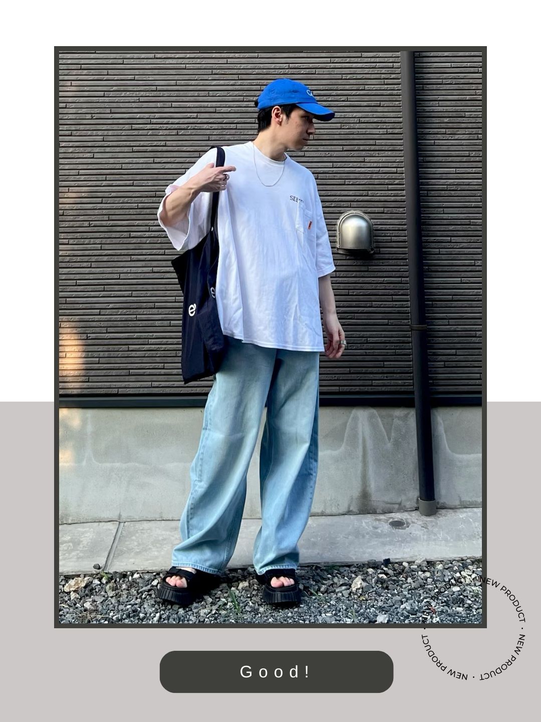 オーバーサイズの白Tシャツにワイドな淡色デニムという、全体的に膨張しやすくラフな組み合わせに対し、足元をブラックの厚底で固定することで、コーディネートに「重石」のような安定感が生まれています。 デニムの淡いブルーと、サンダルの深いブラックのコントラストが、ルーズなシルエットを引き締め、清潔感のある都会的な印象に格上げしています。
