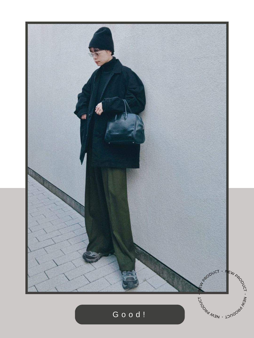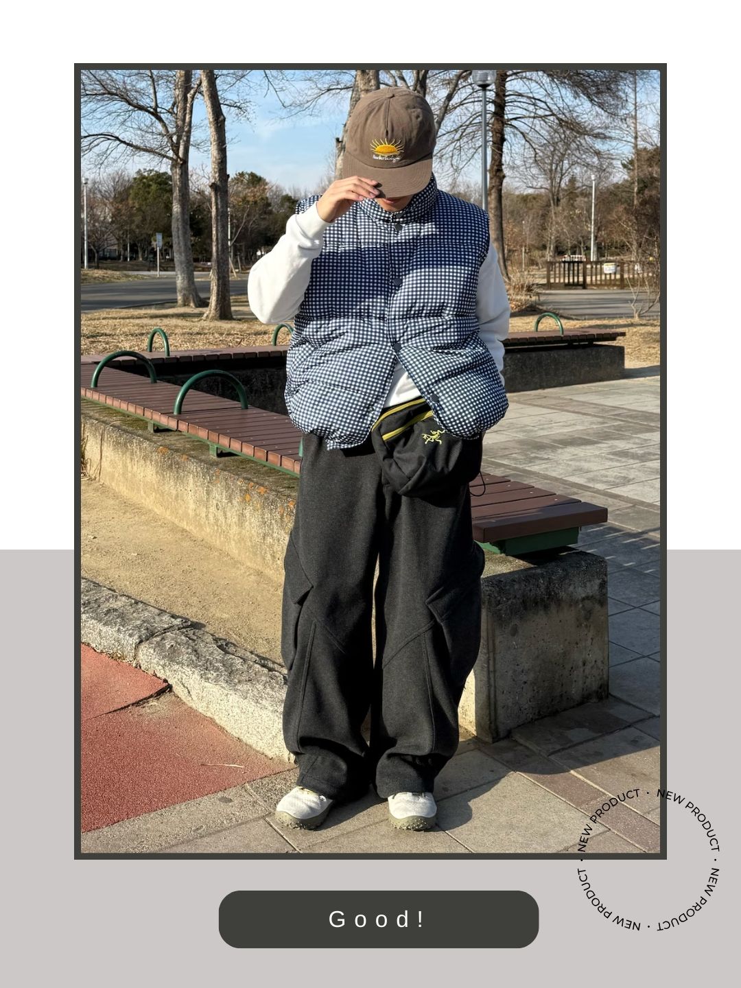 上半身のダウンベストと膝周りに立体的なポケットや切り替えがある超ワイドパンツ。この圧倒的な布のボリュームに対し、MERRELL特有のタフで独創的なフォルムが負けることなくどっしりと全体を支えています。華奢なスニーカーではパンツの裾に飲み込まれてしまいますが、アウトドアギアとしての力強さを持つメレルを選ぶことで足元に確かな存在感を生んでいます。