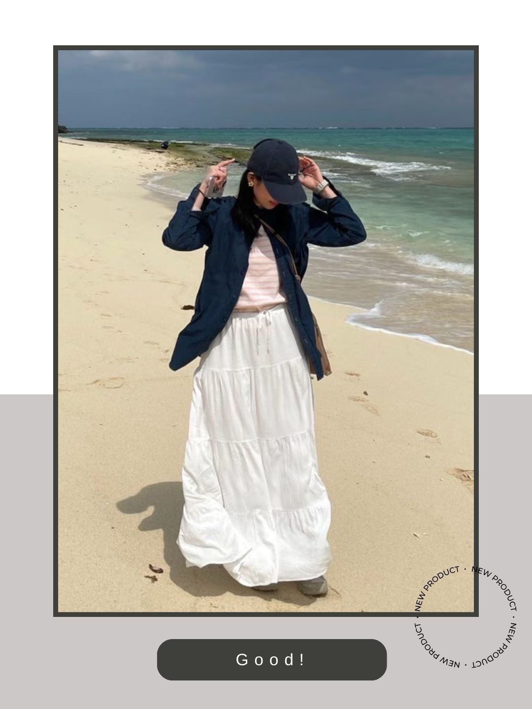フェミニンな白のティアードスカートに対し、本格的なアウトドアブランドのメレルを合わせることで甘さを程よく抑えています。華奢なサンダルではなくあえて無骨なディテールを持つテック系スニーカーを置くことで、コーディネートにアクティブな力強さと現代的なこなれ感が加わっています。