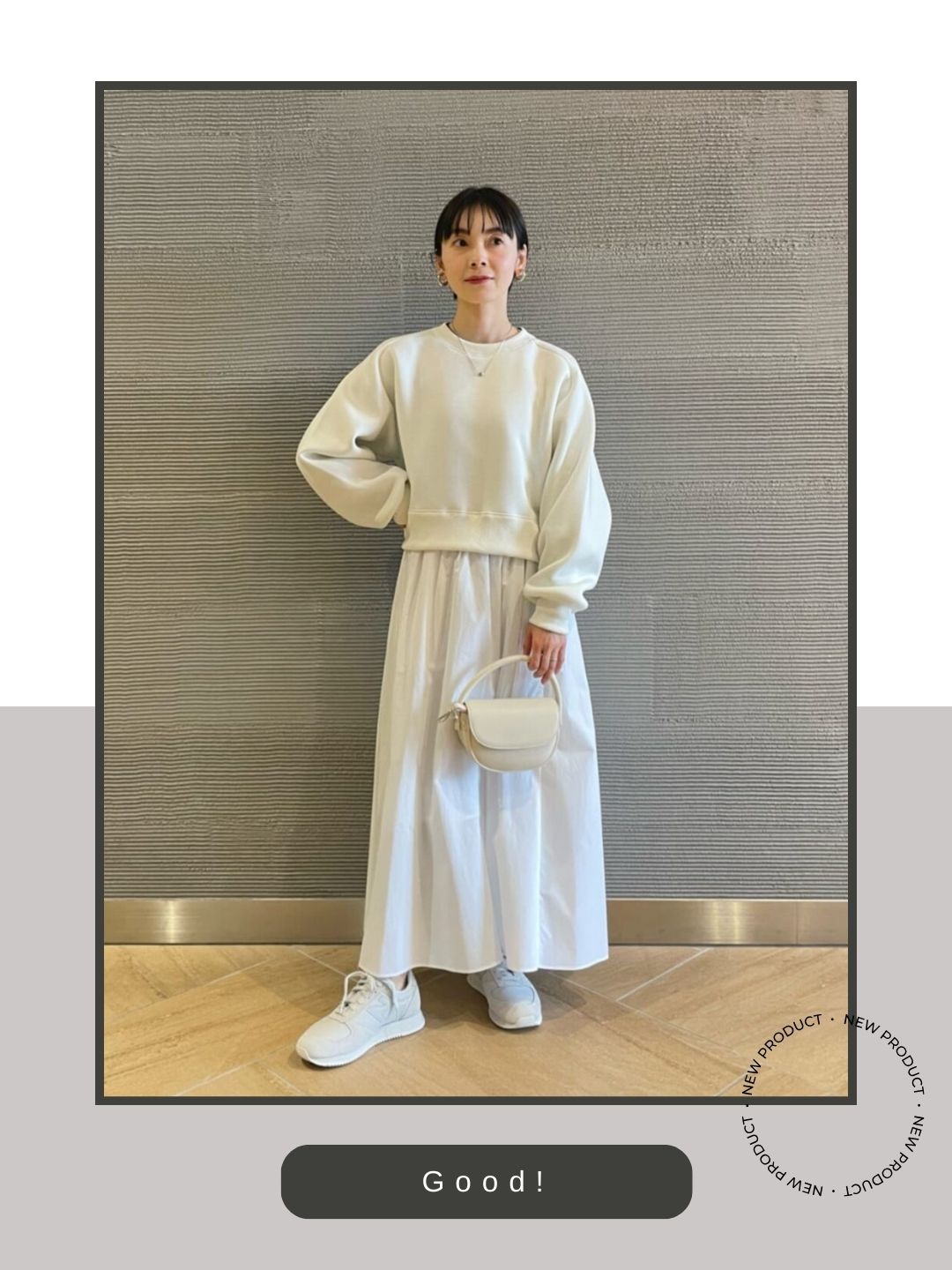 フェミニンなスカートスタイルにあえてレトロなランニングシューズを合わせることで、頑張りすぎない大人の余裕を感じさせる「上品なハズし」が効いたコーディネートに昇華されています。