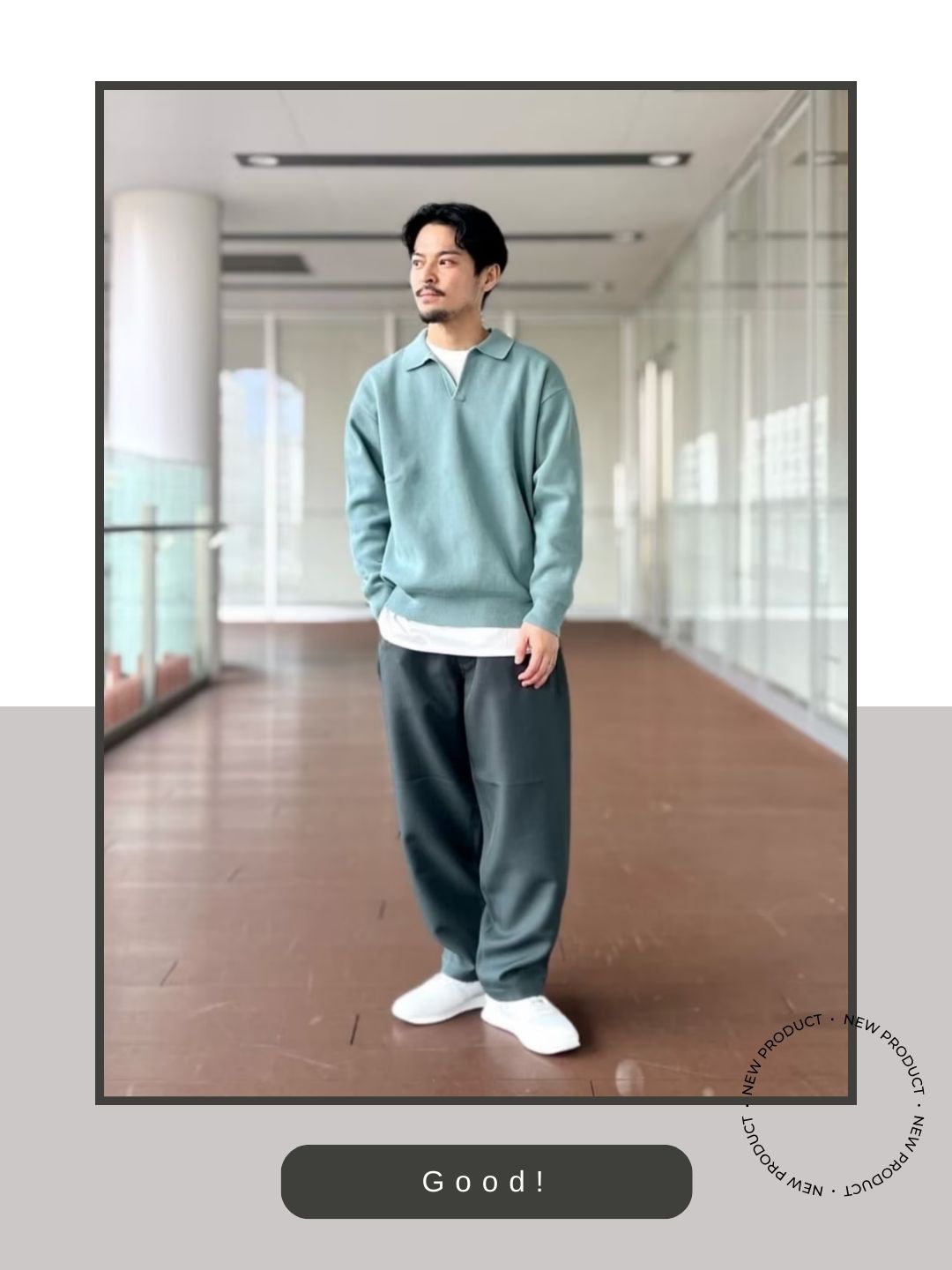 ミントグリーンのポロニットとダークトーンのワイドパンツという落ち着いた配色に対し、足元に真っ白なスニーカーを持ってくることで、全体が重くなりすぎず、都会的でクリーンな印象に仕上げています。