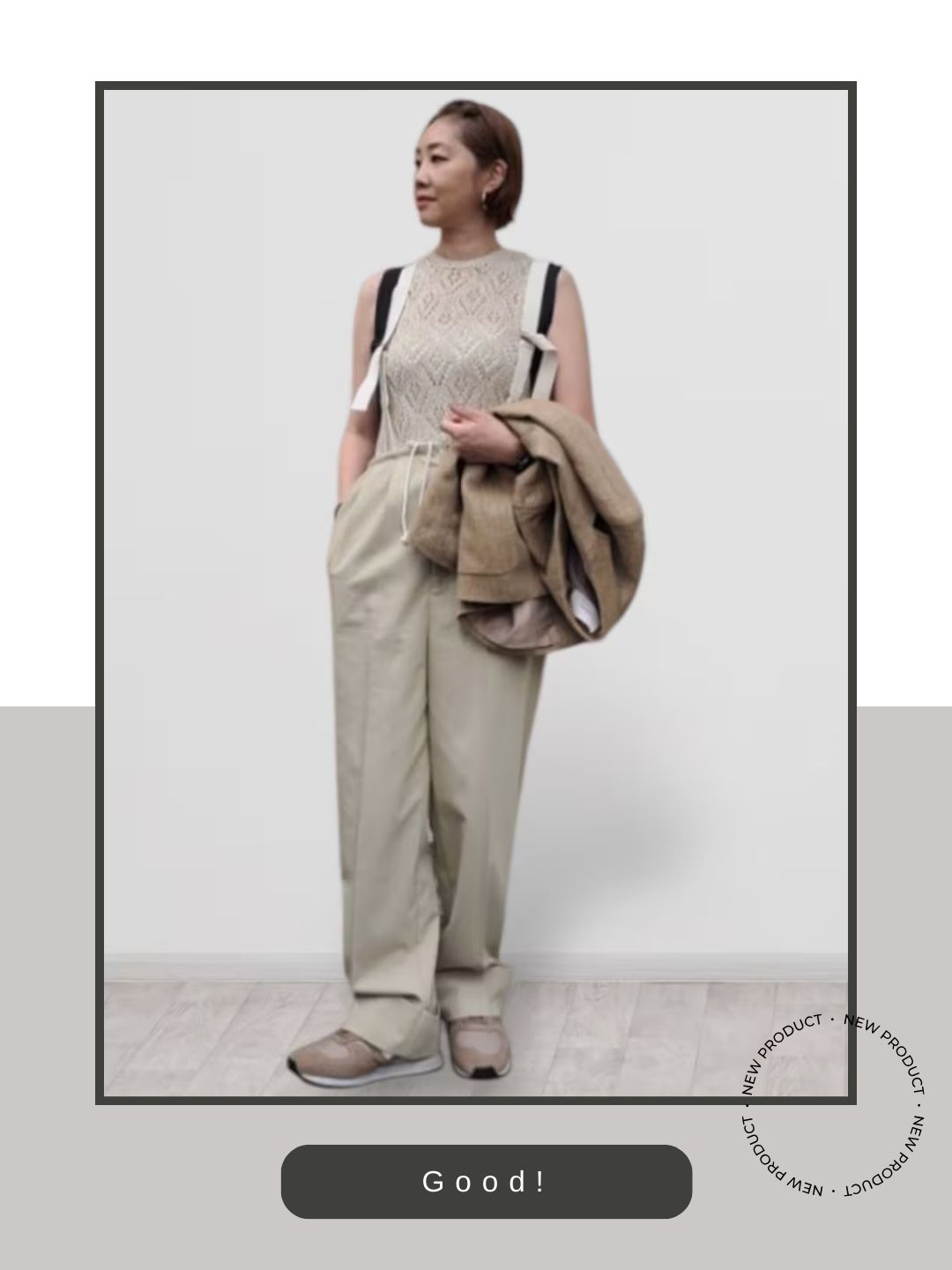 ベージュのニットやジャケット、パンツという柔らかなアースカラーのスタイルに対し、420のベージュ系カラーが自然に馴染み、全身に統一感のある洗練されたグラデーションを作り出しています。