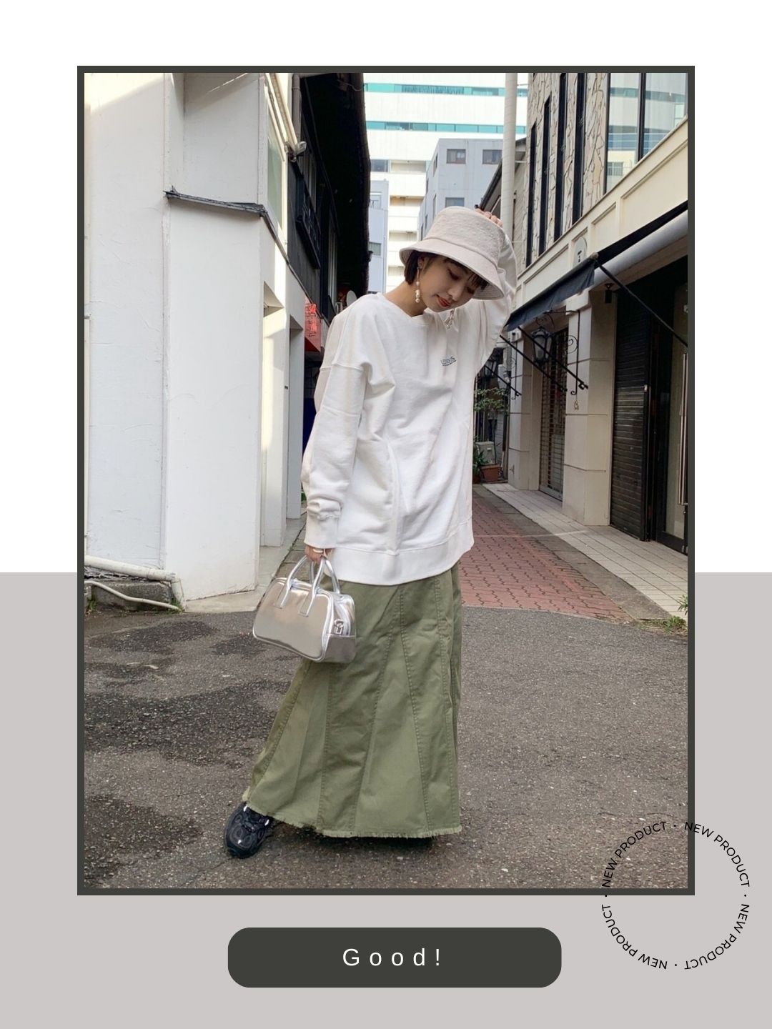 本来、山道を歩くためのタフな機能を備えたML703をあえて女性らしいロングスカートに合わせた「スポーツミックス」のバランスが秀逸です。きれいめな装いにあえて「ギア」としての側面を持つニューバランスを差し込むことで、気取らないけれどこだわりを感じさせるこなれた街歩きスタイルを完成させています。