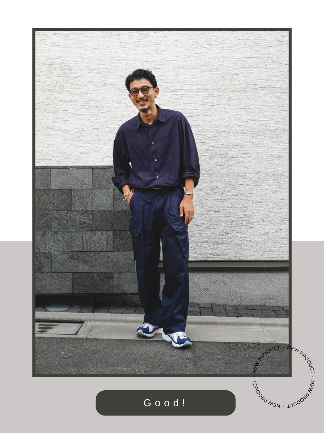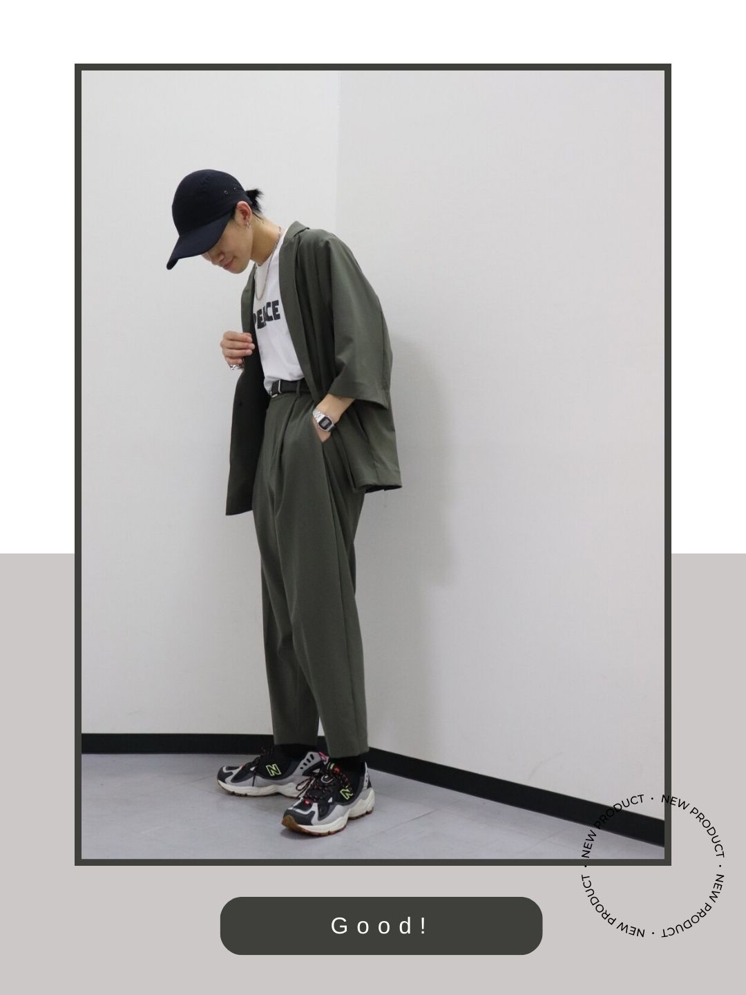 光沢のあるクリーンなシャツという「きれいめ」な要素に対し、メッシュやシンセティックレザーを多用したML703のハイテクな質感を投入した「ハズし」のテクニックが光ります。シルバーのブレスレットやリングといったアクセサリーの硬質感とスニーカーのメカニカルなディテールが共鳴し、大人の余裕を感じさせる都会的なスポーツミックスへと昇華されています。