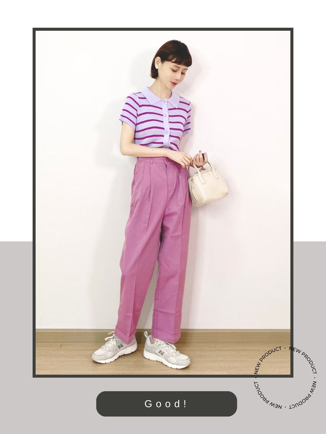 ラベンダー色のボーダーニットとピンクのワイドパンツという、非常にフェミニンでポップなカラーリングに対し、あえて「ML408」という本格的なランニングシルエットを合わせているのが秀逸です。甘くなりすぎがちな配色を、スニーカーの持つアクティブな雰囲気がほどよく中和し、大人の女性にふさわしい「こなれたカジュアル感」が感じられますね。