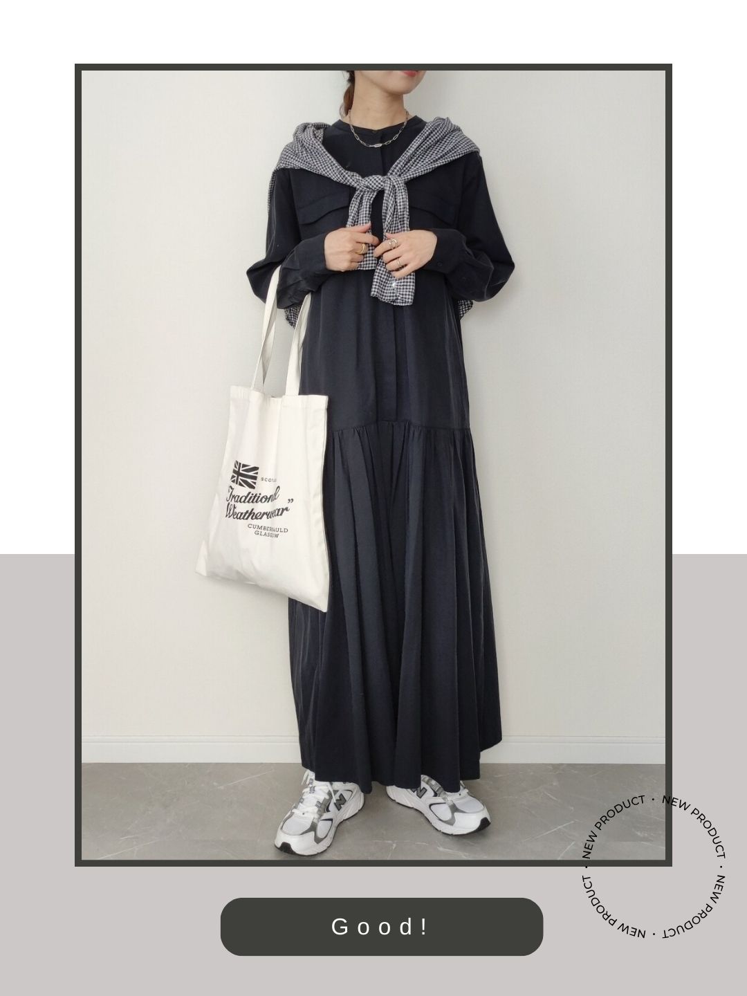 上品で女性らしいシルエットのティアードワンピースに対し、あえてレトロなランニングシューズのML408を合わせる「外し」のテクニックが素敵なコーデ。パンプスやサンダルではなく、少し無骨なスニーカーを選ぶことで、決まりすぎない「こなれ感」が生まれ、日常に馴染む親しみやすいスタイルになっています。