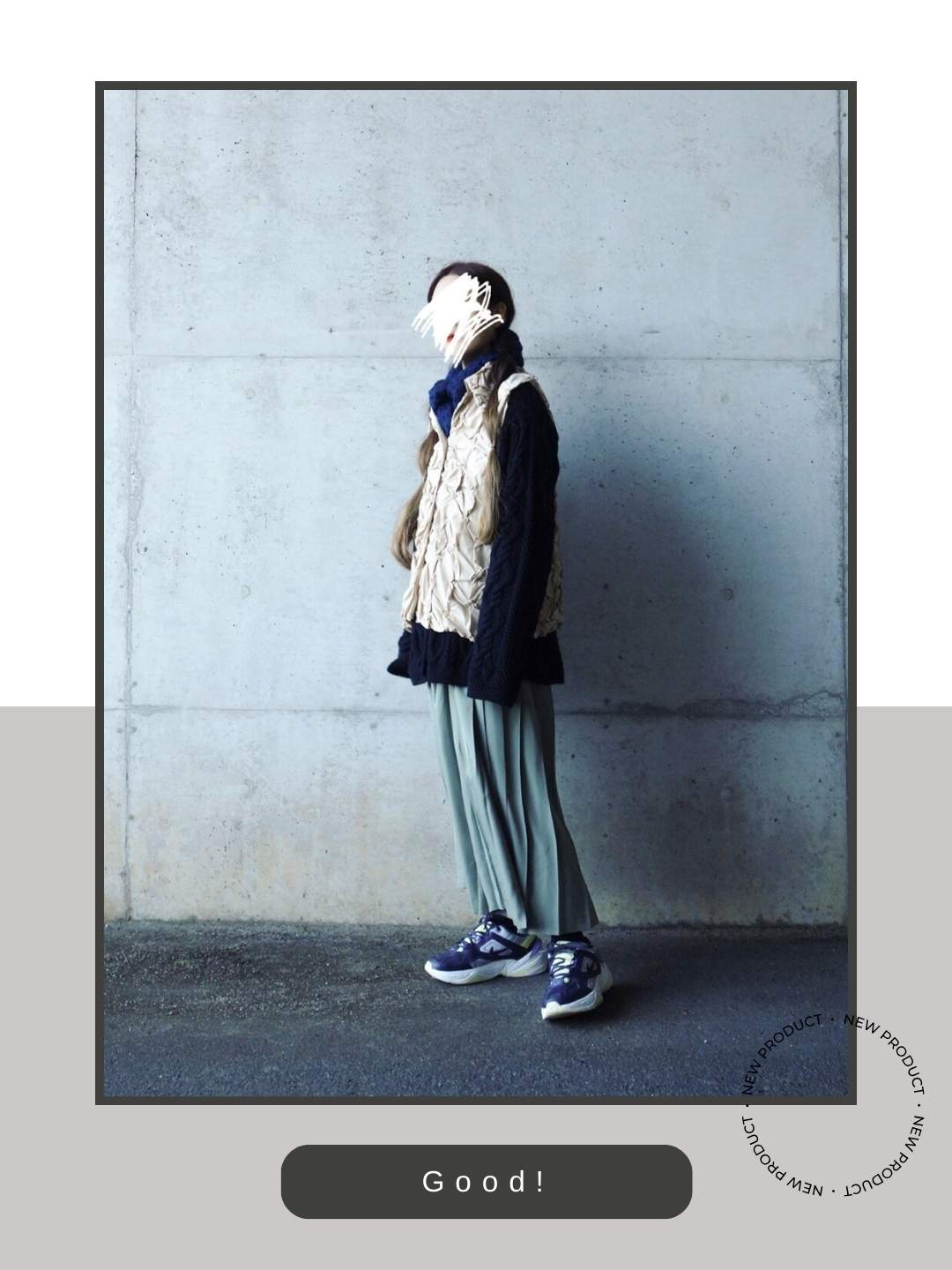 上半身にボリュームのあるニットやテクスチャの強いベストを重ねた重厚なスタイルに対し、ダッドスニーカー特有の厚みがあるM2Kテクノを合わせることで、上下の視覚的なウェイトが均等に保たれ、非常に洗練されたバランスを実現しています。このどっしりとした足元が、複雑なレイヤードを都会的なモードスタイルへと着地させています。