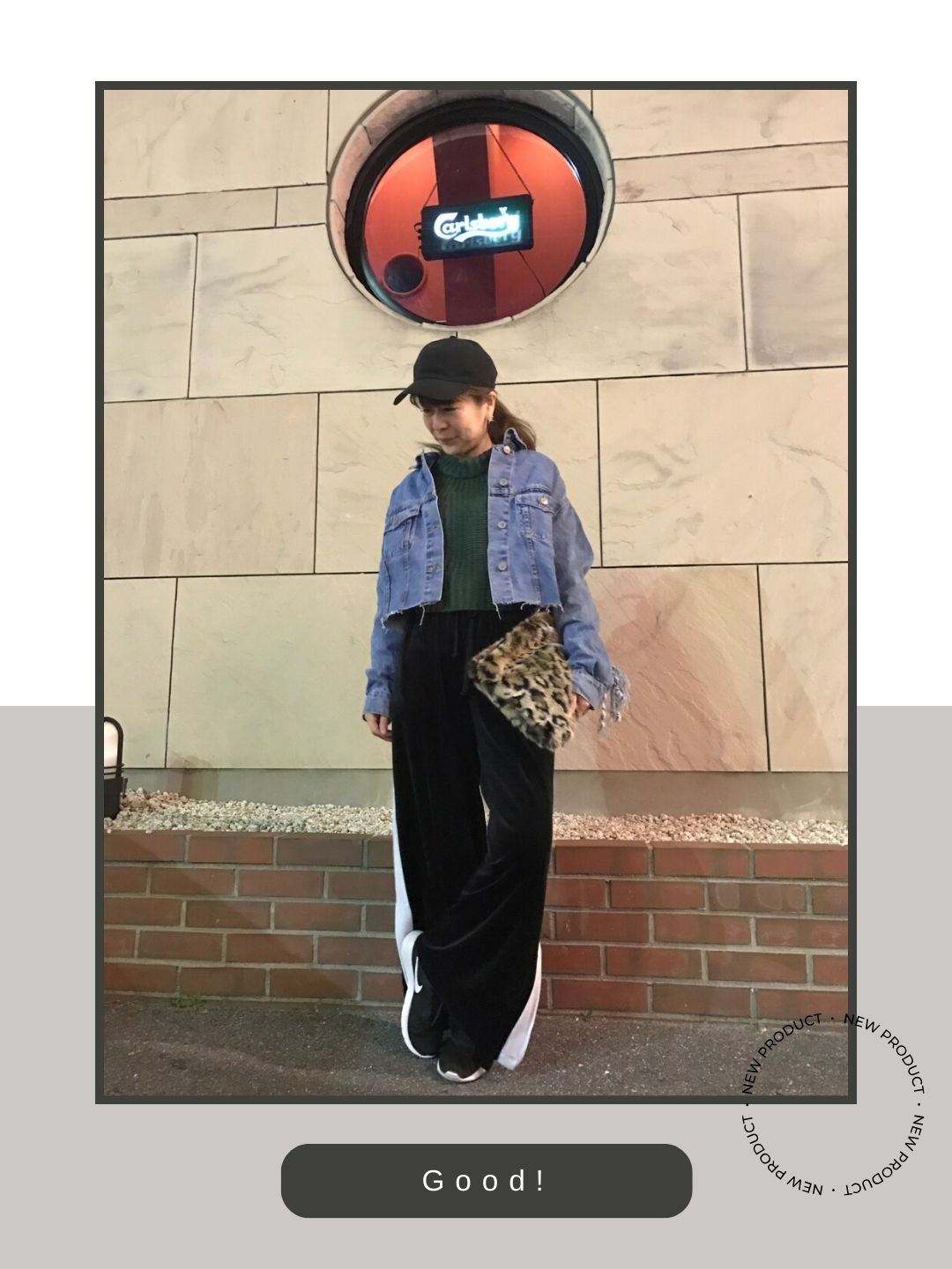 サイドに太いラインが入った存在感のあるワイドパンツに対し、無駄を一切省いたタンジュンのミニマルなデザインが絶妙な引き算として機能しています。パンツにボリュームがある分、足元をタンジュンのようなスッキリとしたシルエットにすることで、全体の印象が重くなりすぎず都会的なバランスを保っています。